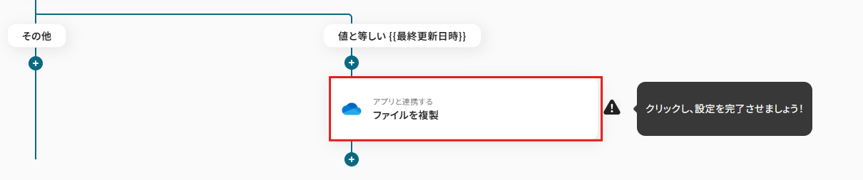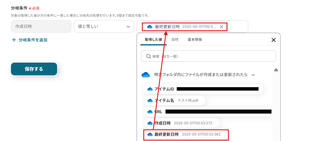 分岐条件は作成日時に設定しました。 更新されたら分岐するように設定を行います。 一番右側を取得した値から「最終更新日時」を選択してください。