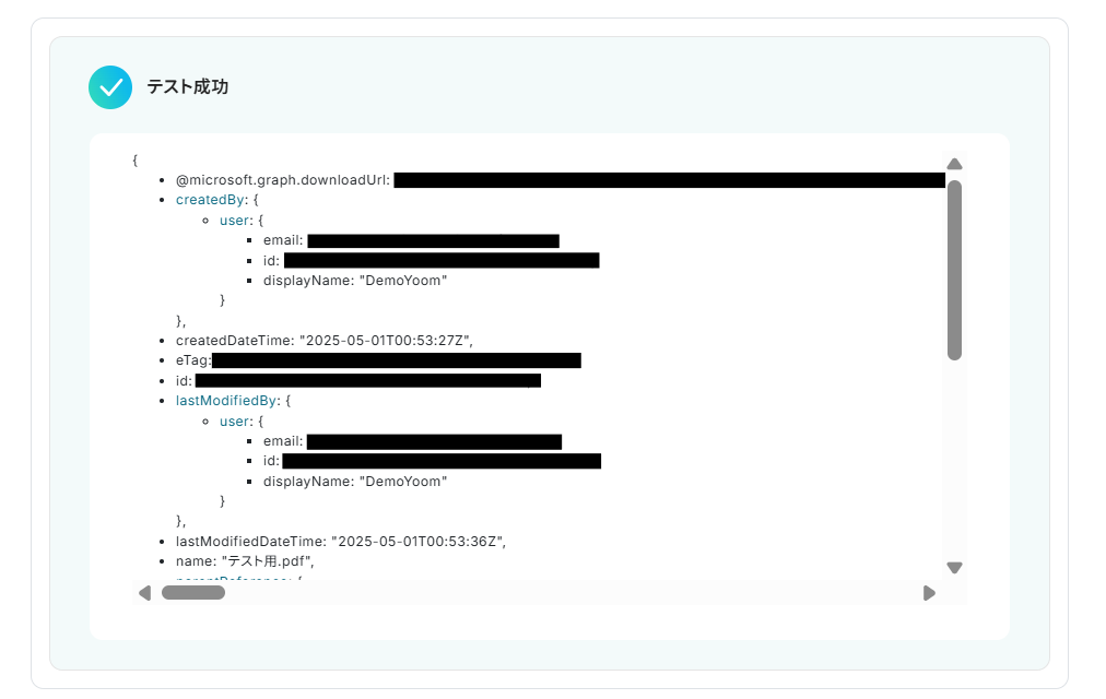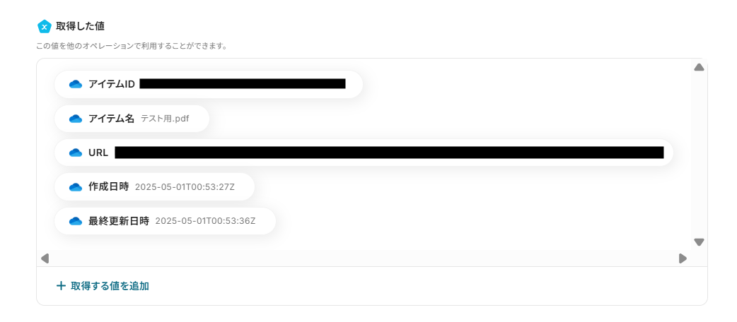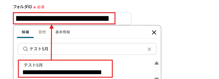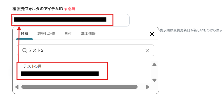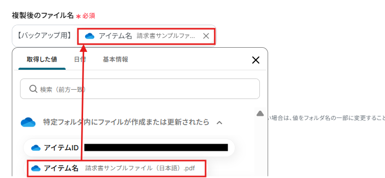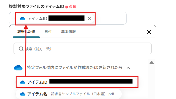 複製対象ファイルのアイテムIDは、取得した値から選択してください。