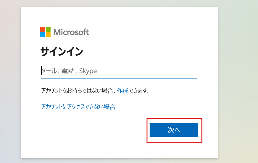 以下の画面が出てきたら、Microsoftにログインします。 アカウントのメールアドレスを入力して次に進んで下さい。