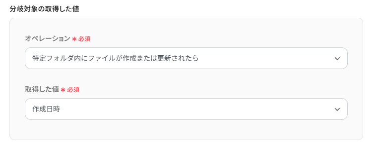 分岐対象の取得した値を設定します。 プルダウンから選択しましょう。 変更したい場合は、プルダウンから変更してください。
