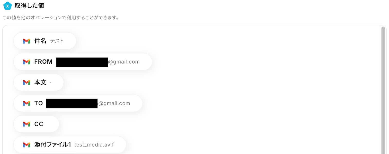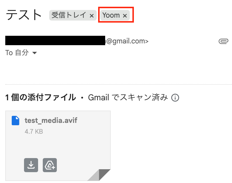 AVIFファイルを添付したメールを送信後、「テスト」をクリックしましょう!テストが成功すると、アウトプットが表示されます。 ここで取得したアウトプットを、後のアクションで利用します。アウトプットについて | Yoomヘルプセンター