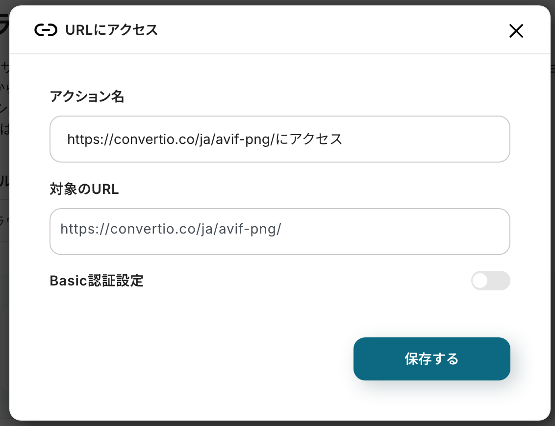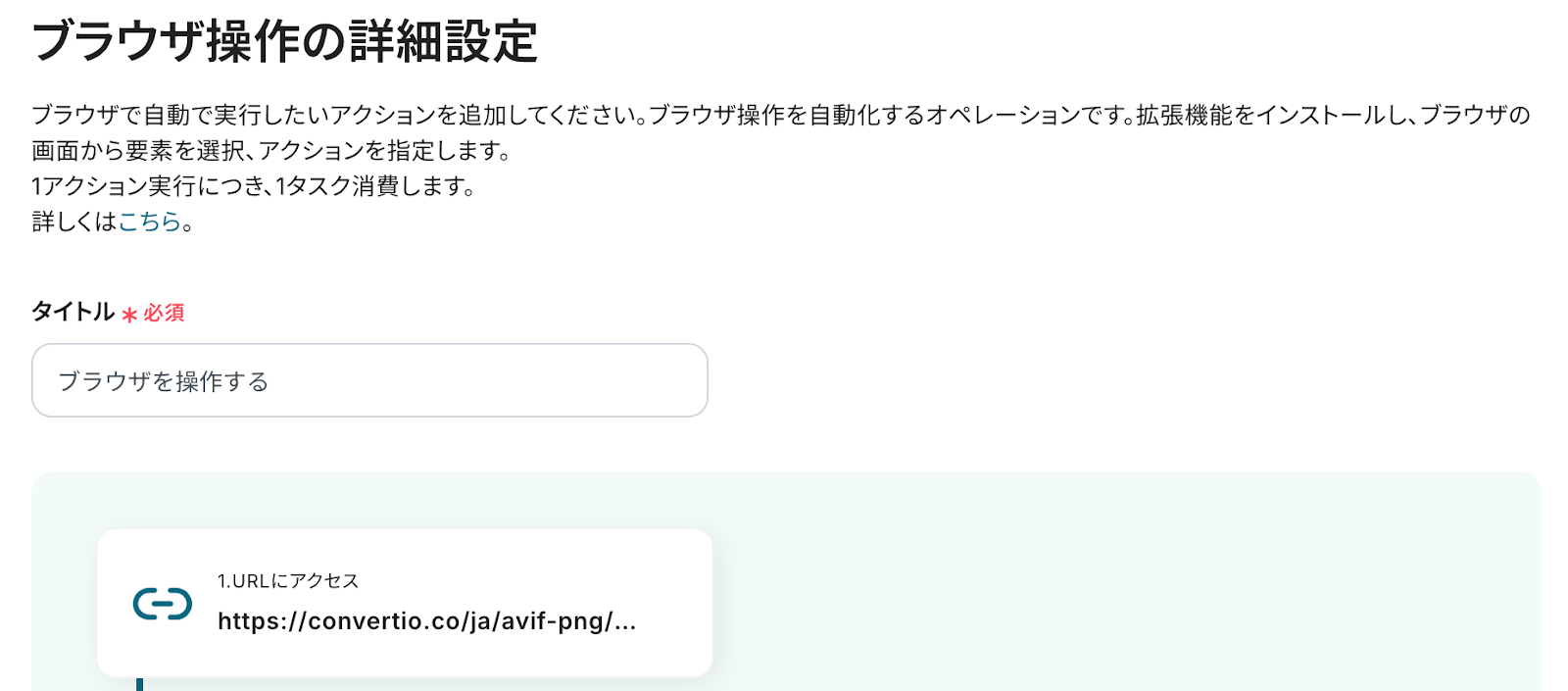※今回は操作例として、外部変換サイトを使用しています。用途や社内ルールなどに応じてURLをカスタマイズして使ってください。 ご自身で指定したサイト上で、アクションを一つずつ設定していきましょう。なお、設定の方法はヘルプページ を参考にしてください!