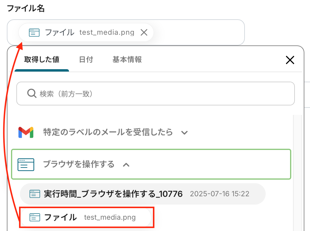 ファイルの添付方法: 「取得した値を使用する」を選択