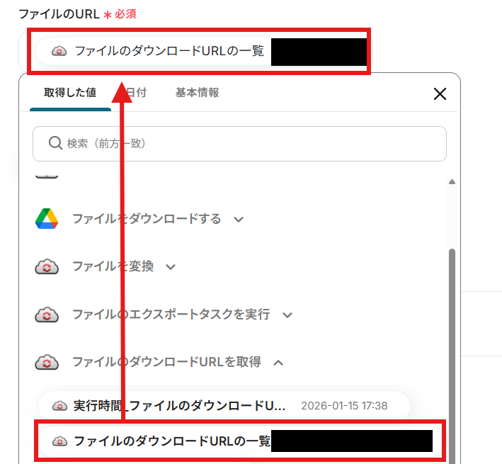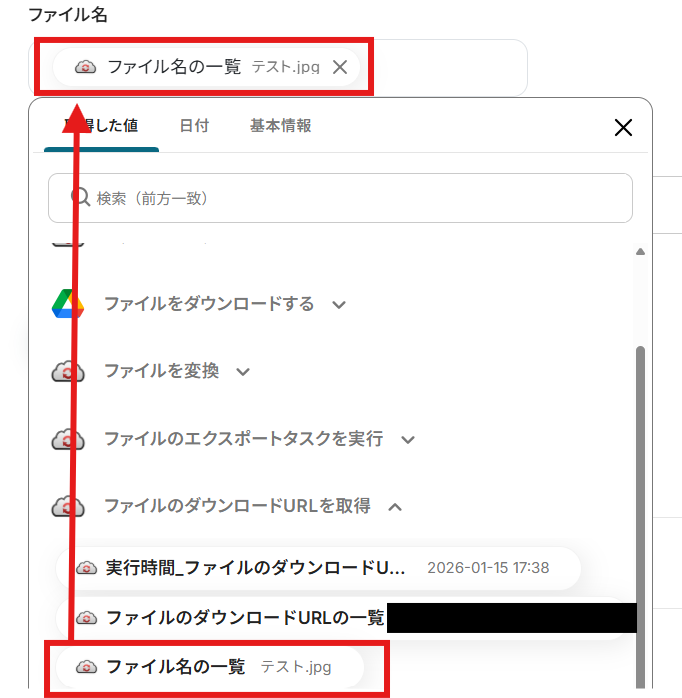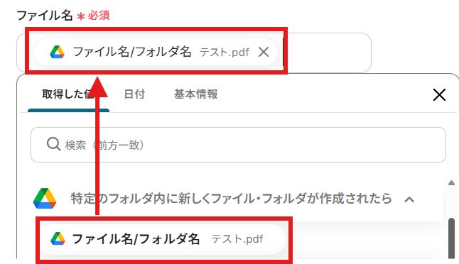 「ファイル名」を設定しましょう。 「取得した値」の使用が可能です!