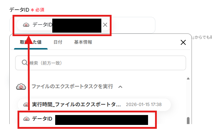 「データID」に、「取得した値」(「ファイルのエクスポートタスクを実行」オペレーションで取得した「データID」)を設定しましょう。