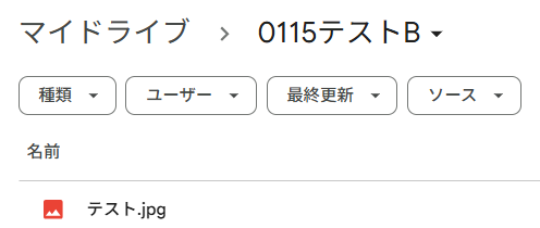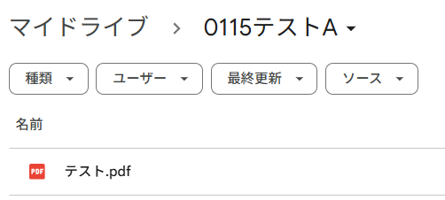 今回のフローで使用したいフォルダの準備がまだの方はこのタイミングで作成し、テスト用のファイルをアップロードしましょう。 例として「0115テストA」のフォルダに「テスト.pdf」をアップロードしました。