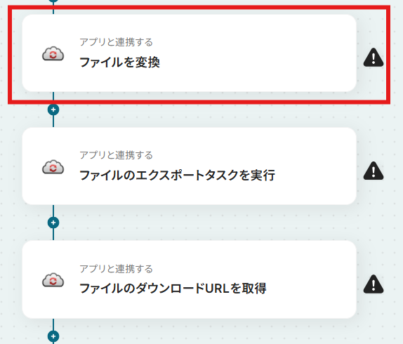 分岐機能では、後続の処理に進む条件を任意に設定することが可能です。例えば、特定のファイル名を持つファイルが投稿された場合のみ実行する、といった条件を追加できます CloudConvertのファイル変換オペレーションでは、変換設定の各項目に固定の値を入力したり、前段の処理で取得した情報を変数として埋め込んだりするなど、柔軟な設定が可能です ※「トリガー」:フロー起動のきっかけとなるアクション、「オペレーション」:トリガー起動後、フロー内で処理を行うアクション