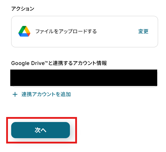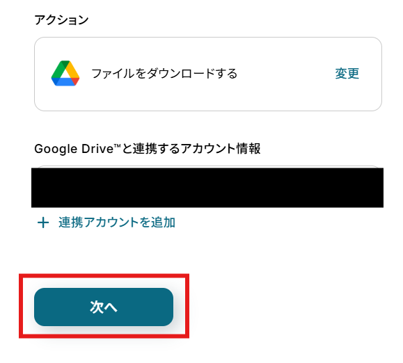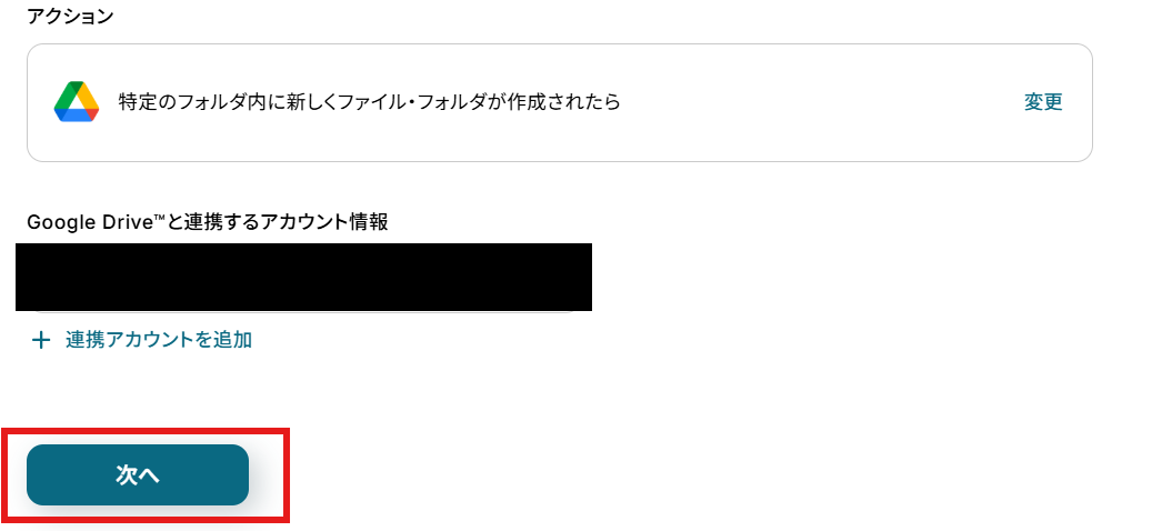 「アクション」はテンプレート通りのままでOKです! 「Google Driveと連携するアカウント情報」を確認し、「次へ」をクリックして進んでください。