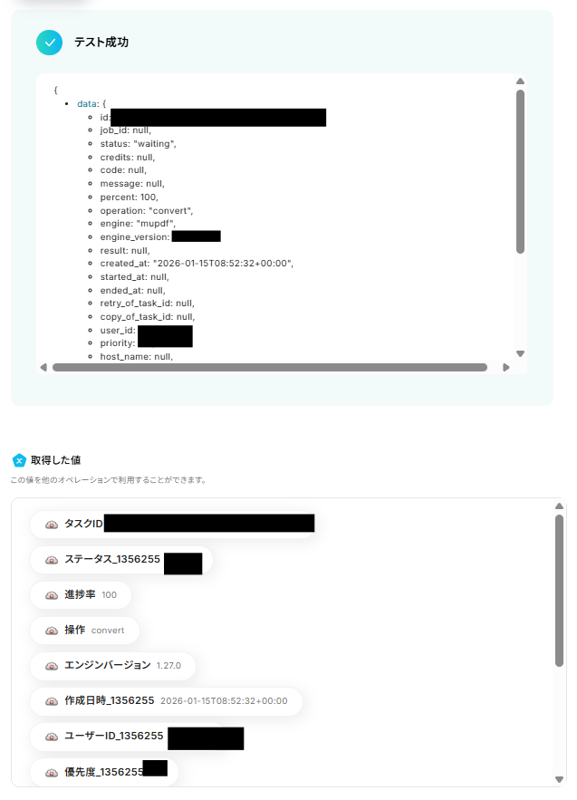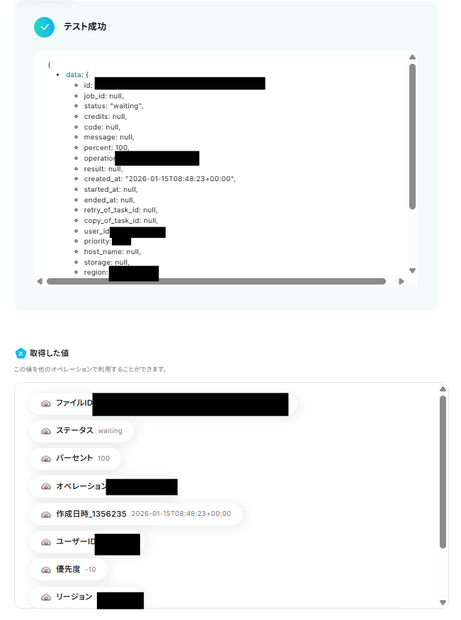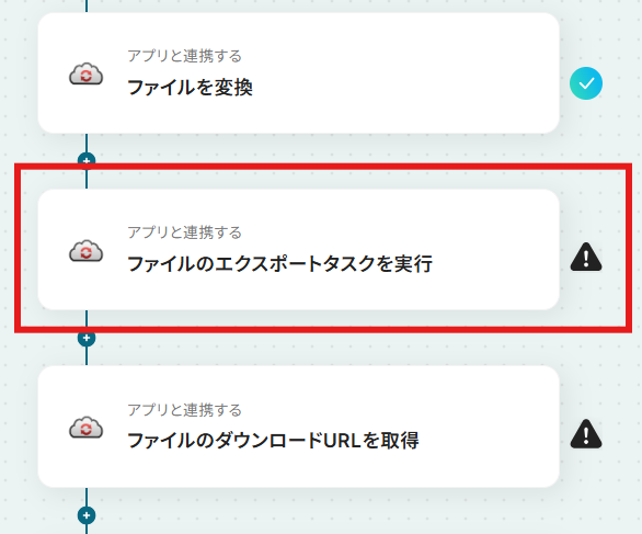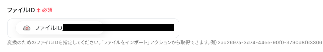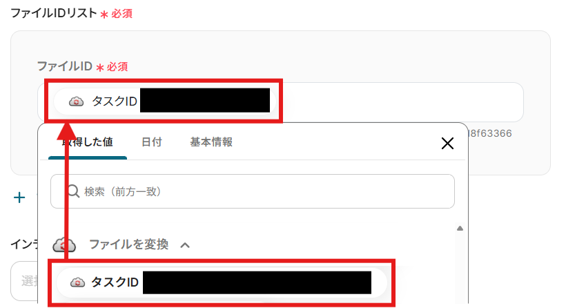 「ファイルIDリスト」に「取得した値」(「ファイルを変換」オペレーションで取得した「タスクID」)を設定しましょう。