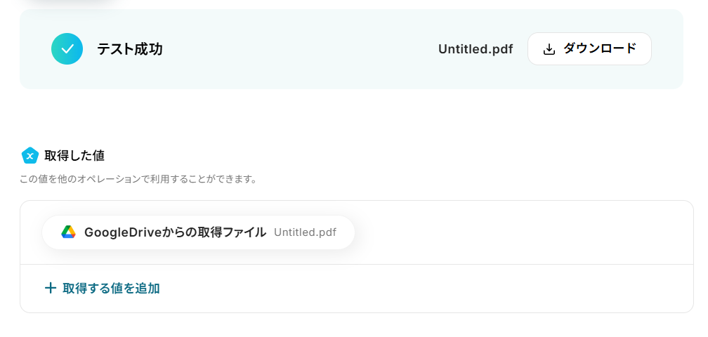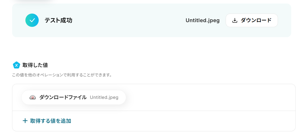 設定できたら「テスト」を行いましょう。 テストに成功すると、対象のファイルがダウンロードされます。 この時、ダウンロードされたファイルの名前は「Untitled」で固定されるため、正しいファイルであるかを確認する場合は「ダウンロード」をお試しください。 「完了」を選択しましょう。