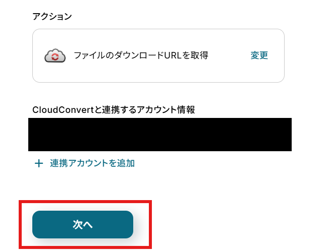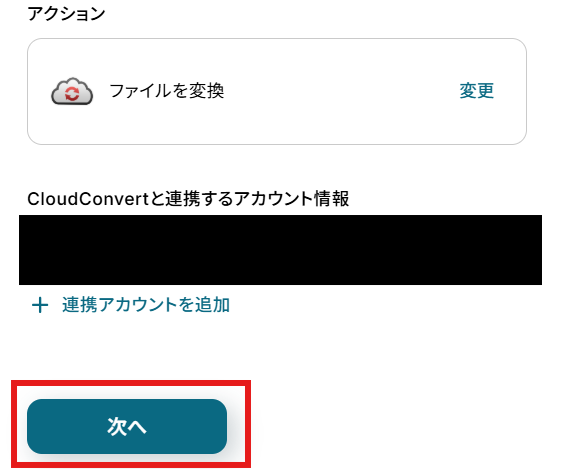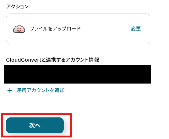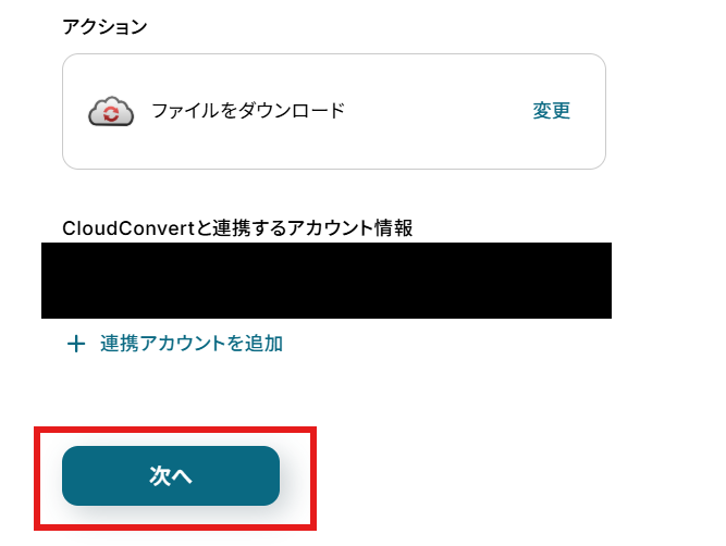 「アクション」はテンプレート通りのままでOKです! 「CloudConvertと連携するアカウント情報」を確認し、「次へ」をクリックして進んでください。