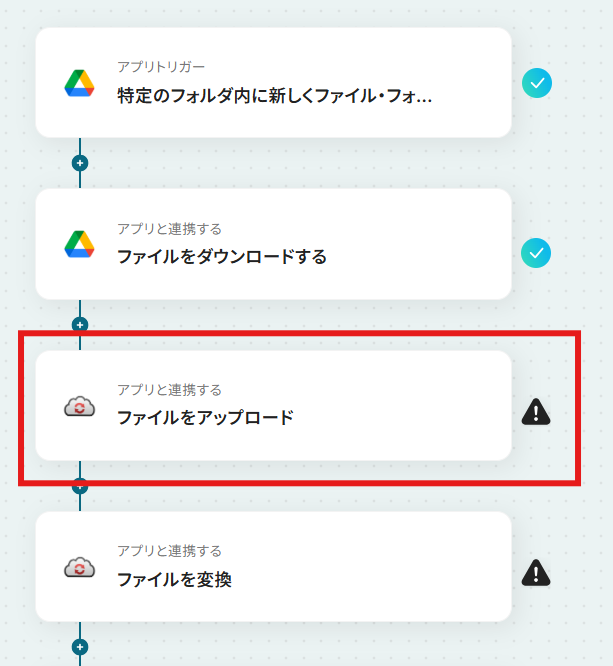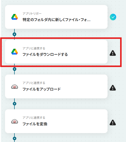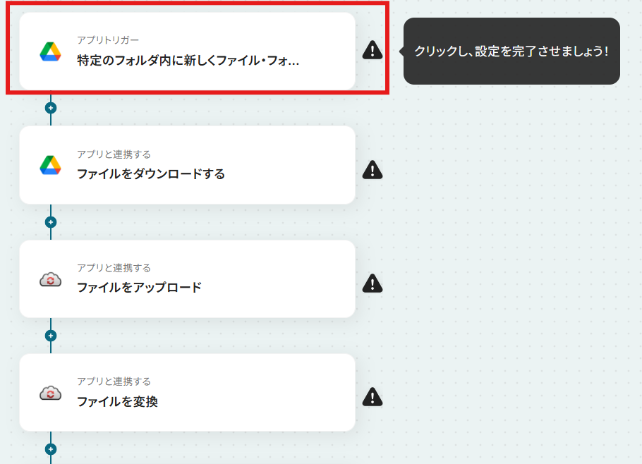 Google DriveとCloudConvertを連携してファイル変換を自動化するフローを作ってみよう それではここから代表的な例として、Google Driveに特定のファイルがアップロードされたら、CloudConvertで指定の形式に自動で変換し、別のフォルダに保存するフローを解説していきます!