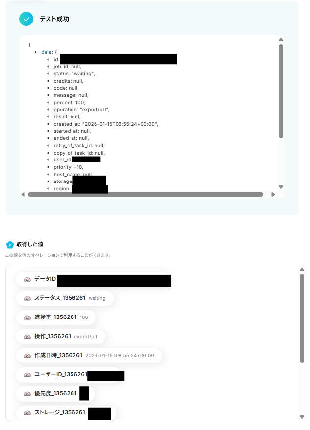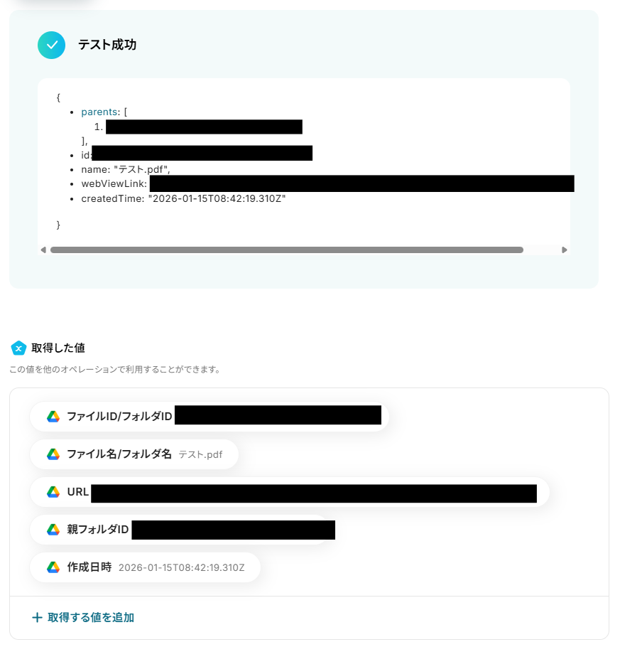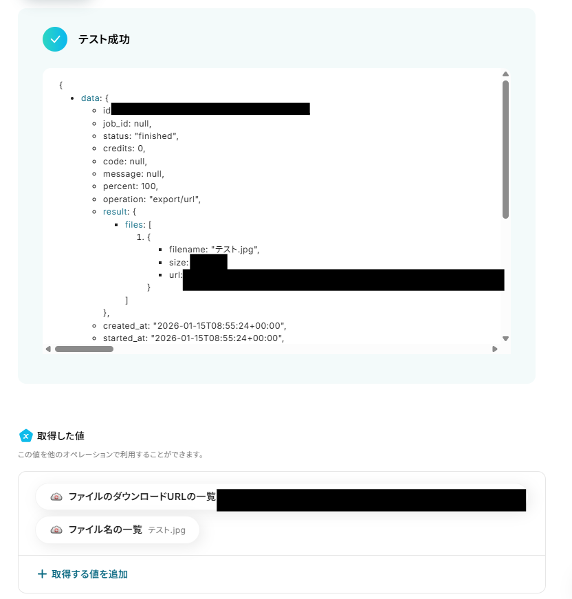 設定できたら「テスト」を行いましょう。 テストに成功すると「取得した値」に反映されます。 「完了」を選択しましょう。
