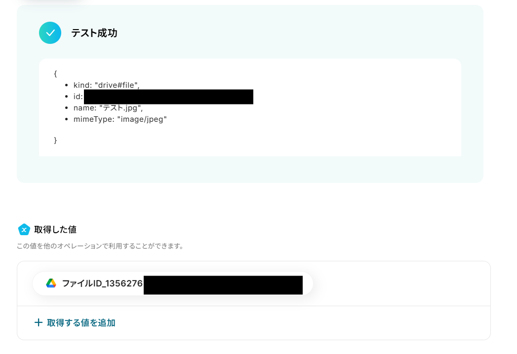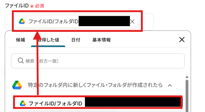 「ファイルID」を「取得した値」から設定しましょう。 取得した値は変数となります。 固定値ではないため、トリガーが実行されるたびに取得した情報を反映できます。