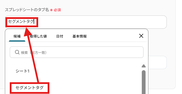 「データベースの連携」箇所で、上記のGoogle スプレッドシートを候補から選択していきます。 シートIDも同様に候補から指定してください。