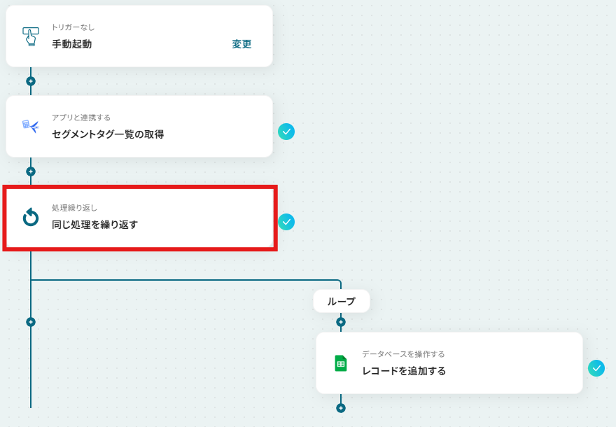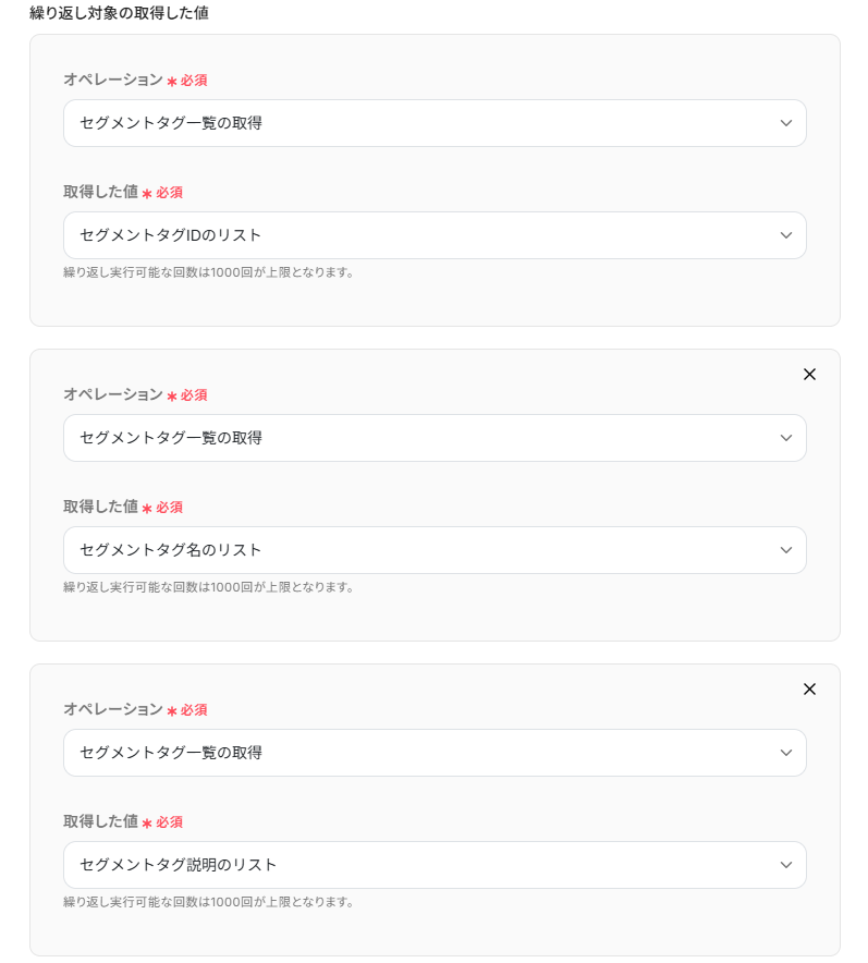 ※「同じ処理を繰り返す」オペレーションを使う場合は、チームプランまたはサクセスプランが必要です。フリープラン・ミニプランだと、設定してもエラーになってしまうのでご注意ください。