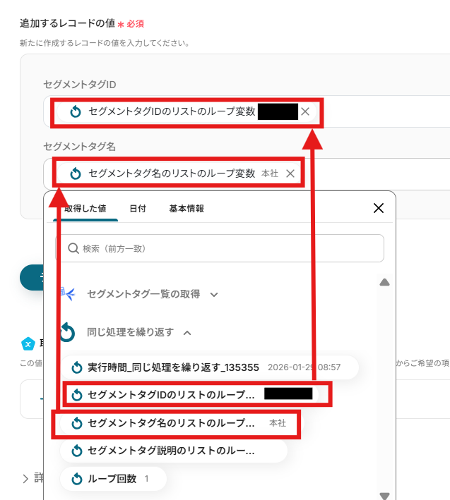 ここはすでにデフォルトで値が入っています。 「繰り返し対象の取得した値」が以下のようになっているか確認しましょう。