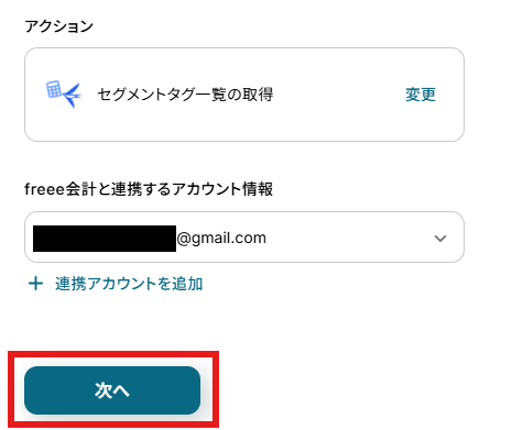 アクションはデフォルト設定のまま、アカウント情報は連携したいアカウントが選択されているか確認してください。確認出来たら「次へ」をクリックしましょう。