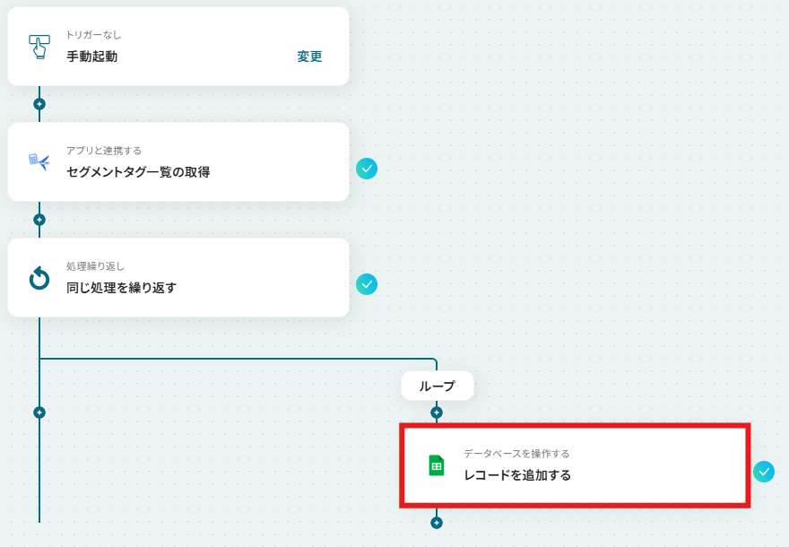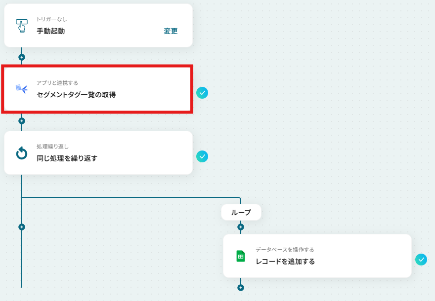 freee会計のアクション設定で、対象となる事業所IDを任意で指定してください ループ機能の設定では、前段のfreee会計のアクションで取得したセグメントタグ一覧のデータの中から、繰り返し処理を行いたい項目を選択してください Google スプレッドシートへの追加アクションでは、書き込み対象としたい任意のスプレッドシートIDやシート名を指定してください ■注意事項
