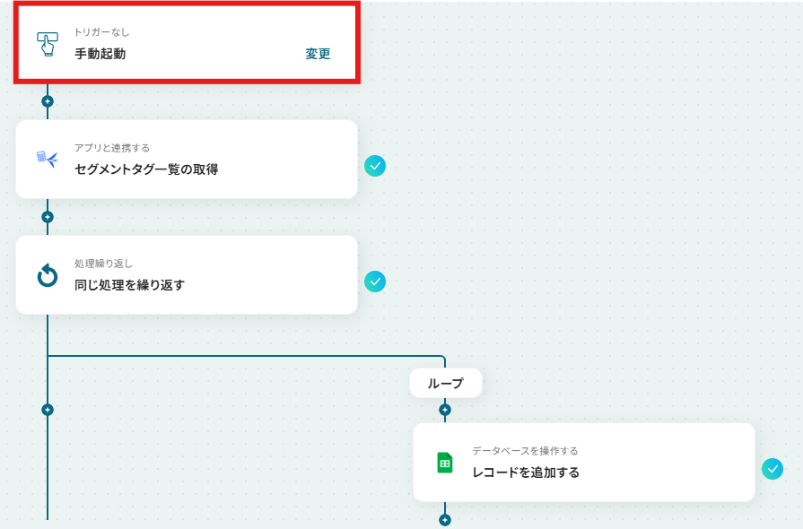 このフローボットでトリガーになっているのは「手動起動」で、任意のタイミングでフローボットを起動できる機能です。 参考:👆手動起動の設定方法