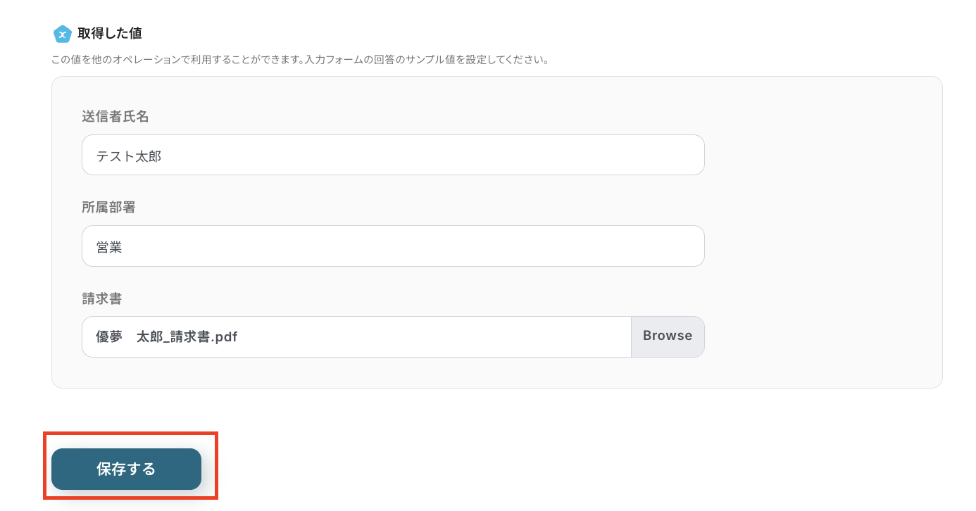 「取得した値」に、テスト用の回答値と請求書を添付し、「保存する」を押して次の設定に進みましょう!