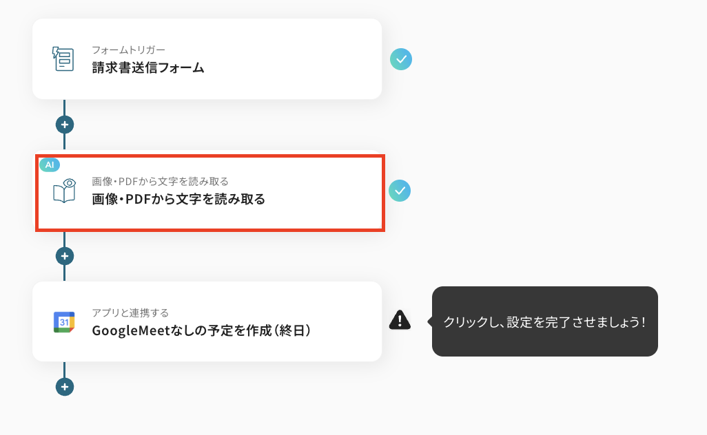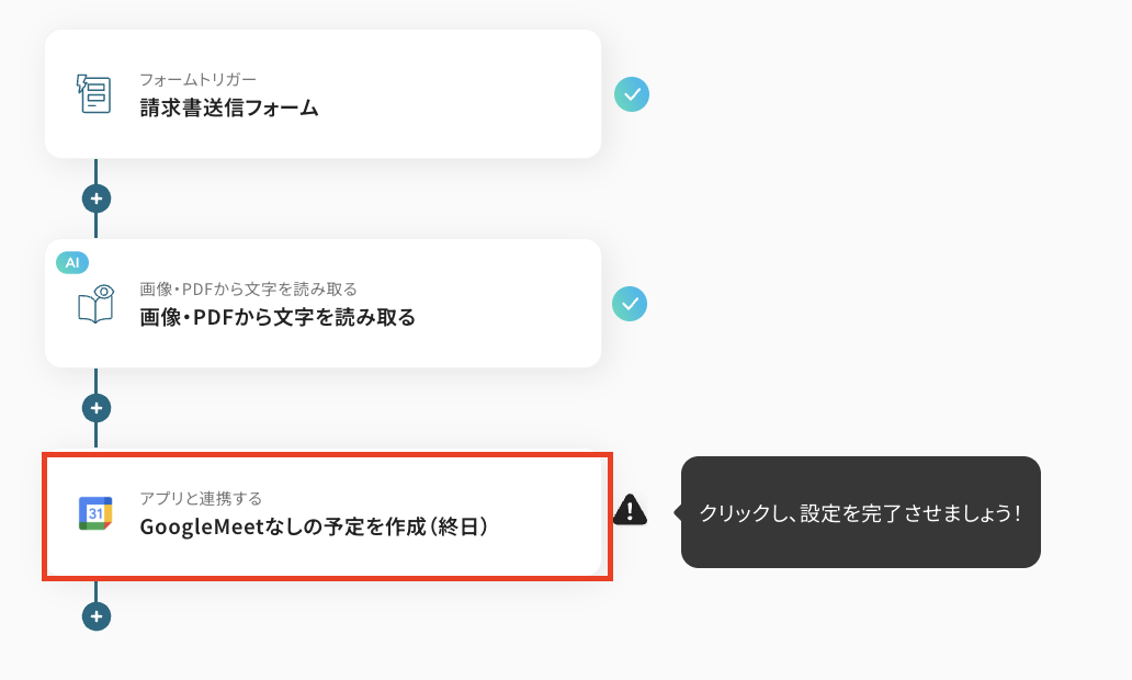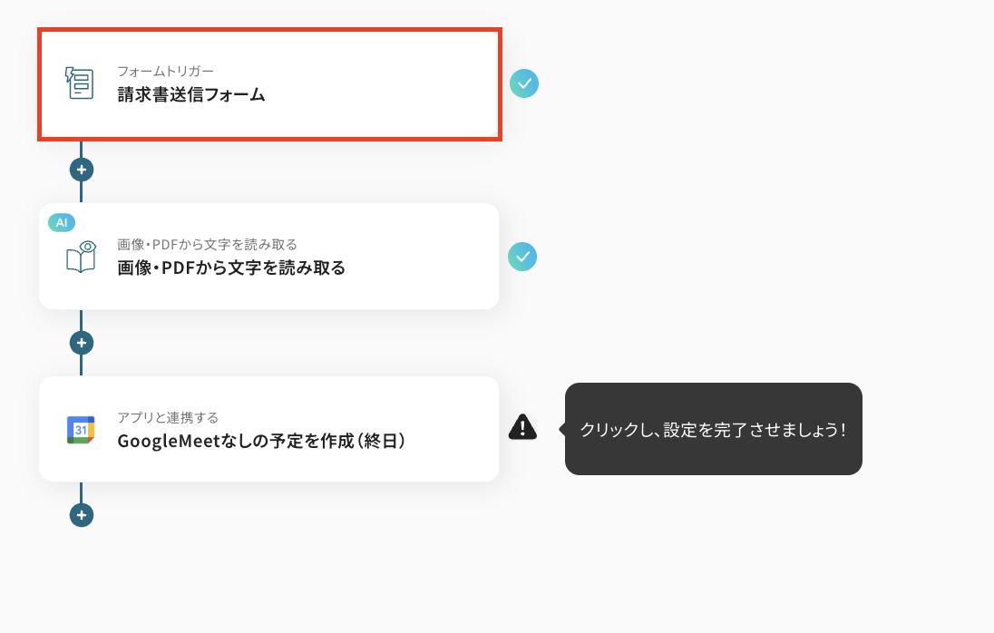 それではここから代表的な例として、「フォームで受信した請求書の情報をOCRで読み取り、その支払期日を自動でGoogleカレンダーに登録する」フローの作成手順を解説していきます!