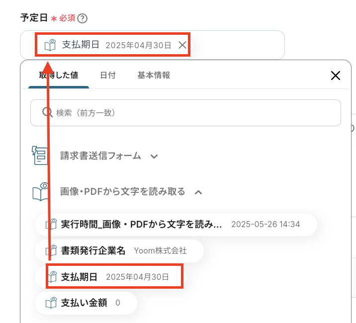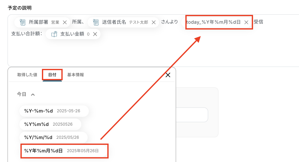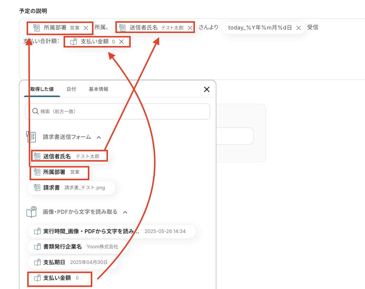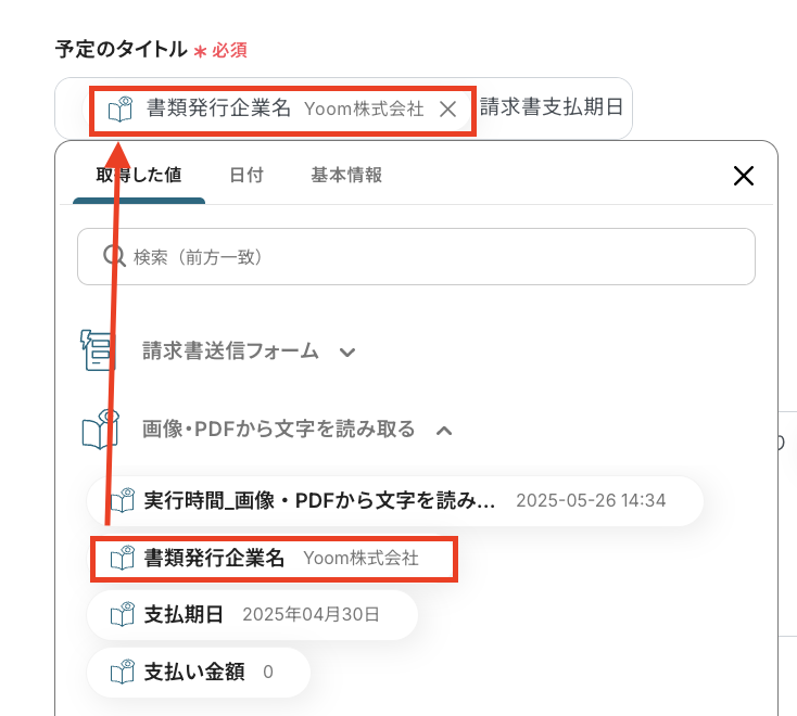 ・予定のタイトル:作成する予定のタイトルを指定します。下図のようにアウトプットを活用することで、請求書の情報を引用したタイトルを、自動的に作成することもできますよ!