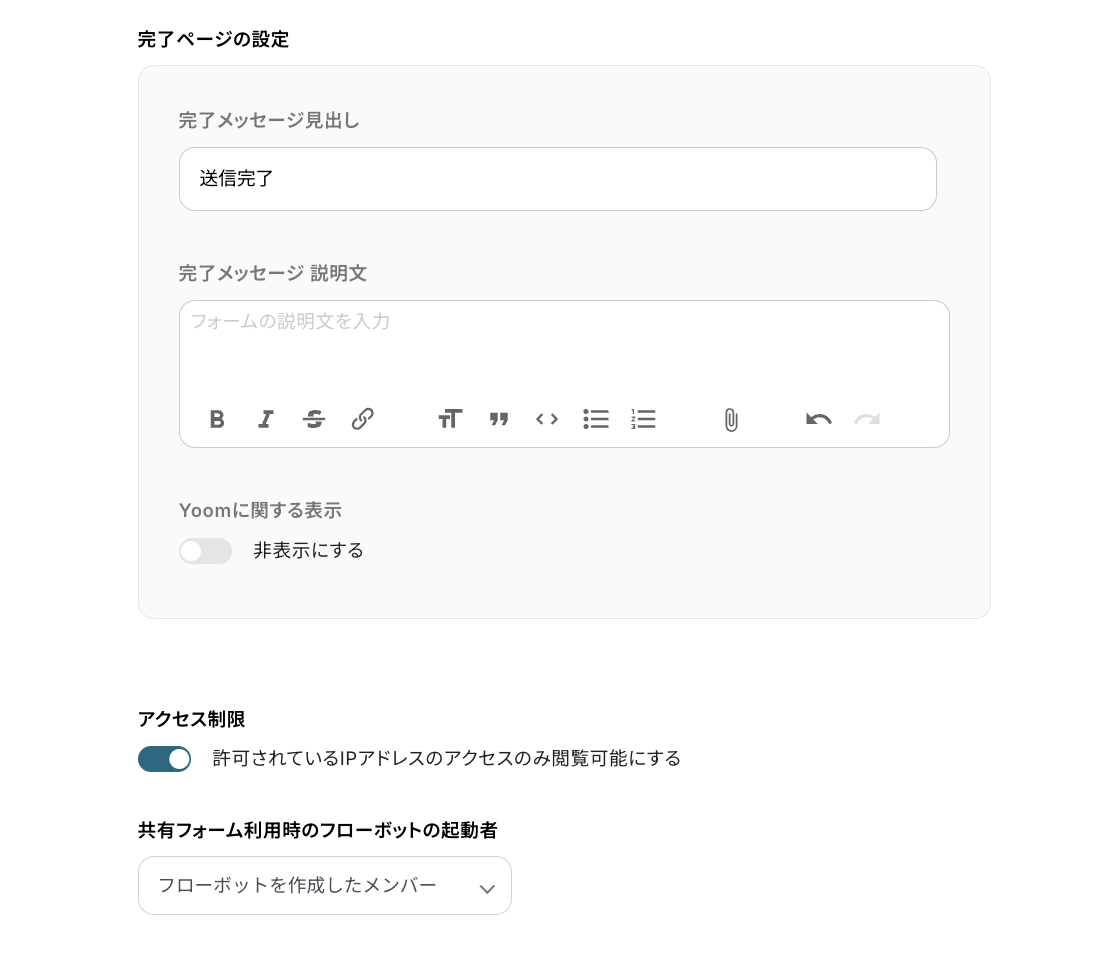 フォームへのアクセス権限を許可されているIPアドレスのみ閲覧可能にしたい方は、「ON」にしてください。