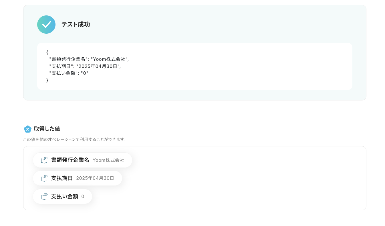※YoomのOCR機能では、アクション記載の規定の文字数を超えるデータや、文字が小さすぎる場合に正しく読み取れないことがあります。文字数や文字の大きさには少し余裕を持たせてご利用ください。