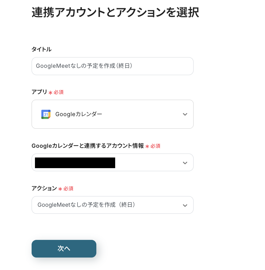 タイトルは必要に応じて編集し、連携するアカウント情報がフローで使用するものであっているかどうかを確認しましょう。アクションは変更せず、「次へ」をクリックしてください。