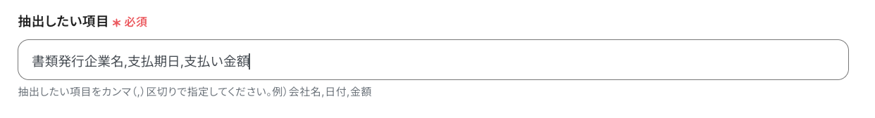 ・抽出したい項目:ファイルから抽出したいテキストデータの項目を設定します。「会社名」や「支払期日」など、抽出したい項目をカンマ(,)区切りで入力してくださいね!