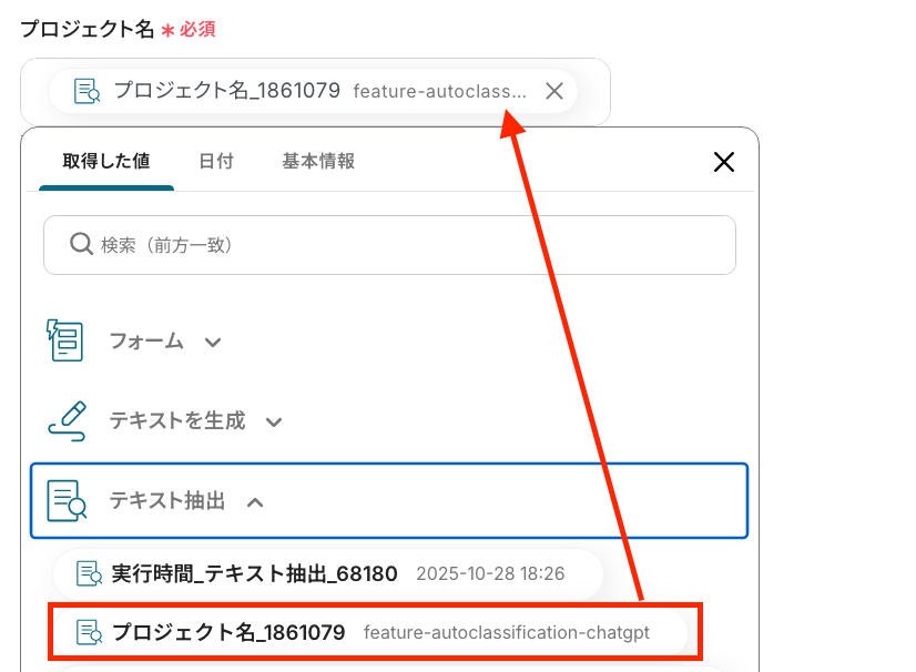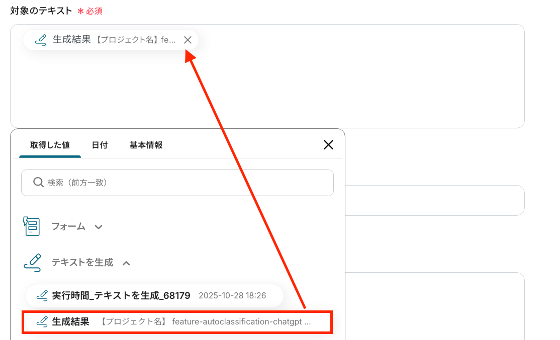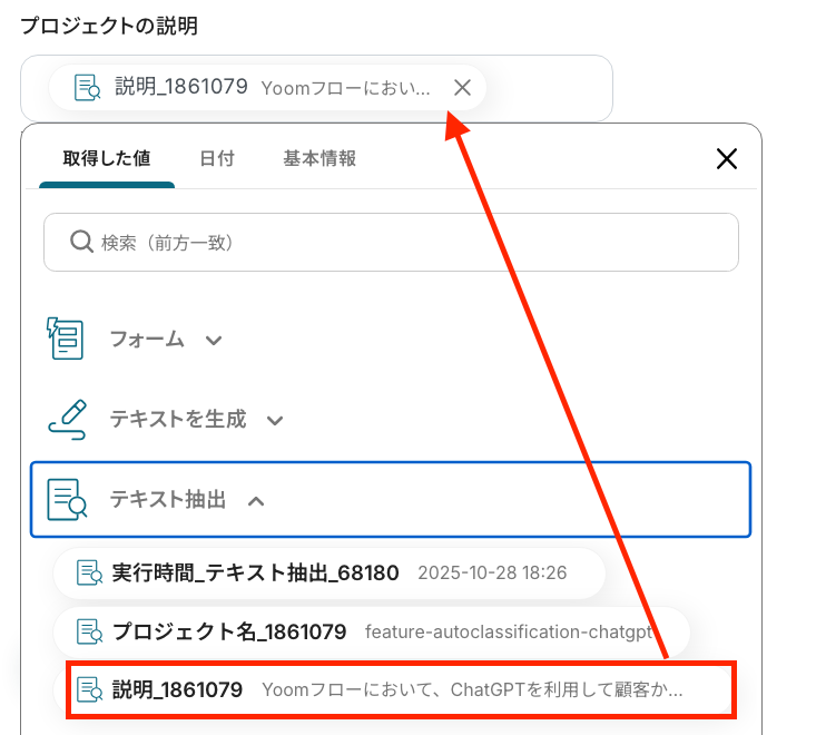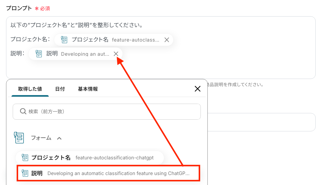 以下の画像のように、入力欄をクリックして表示される取得した値を設定してください。