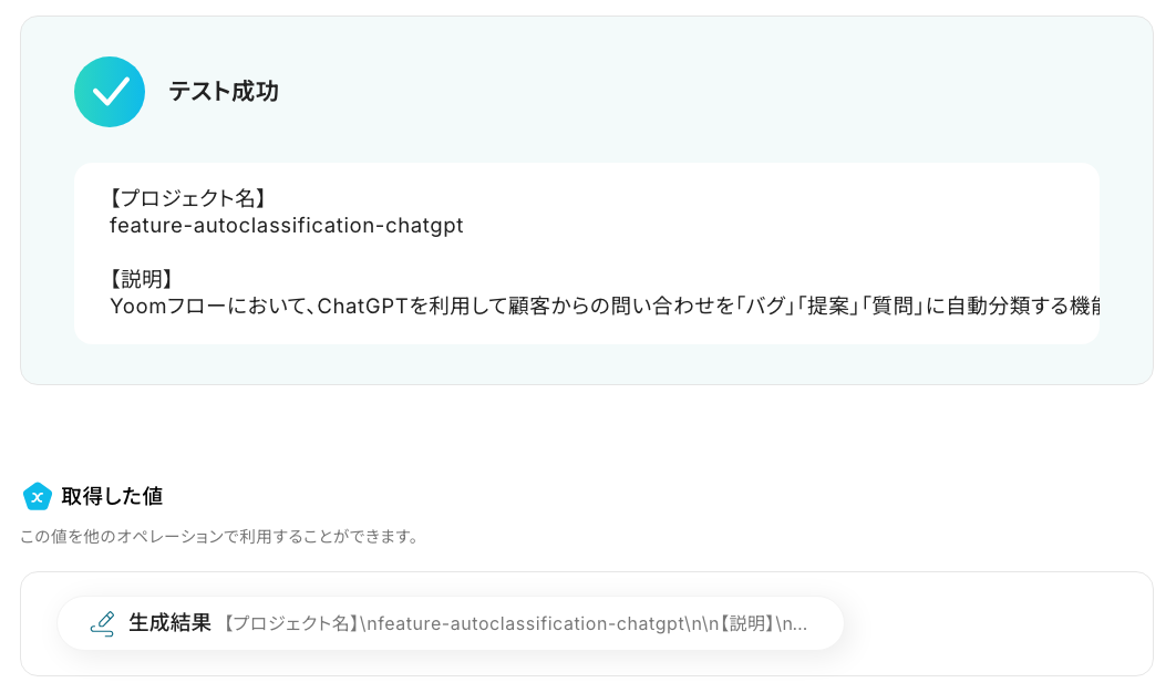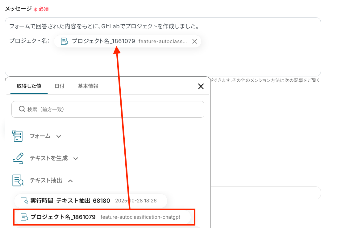 以下の画像のように、任意で作成した文章と先ほど取得した値を組み合わせて設定してください。