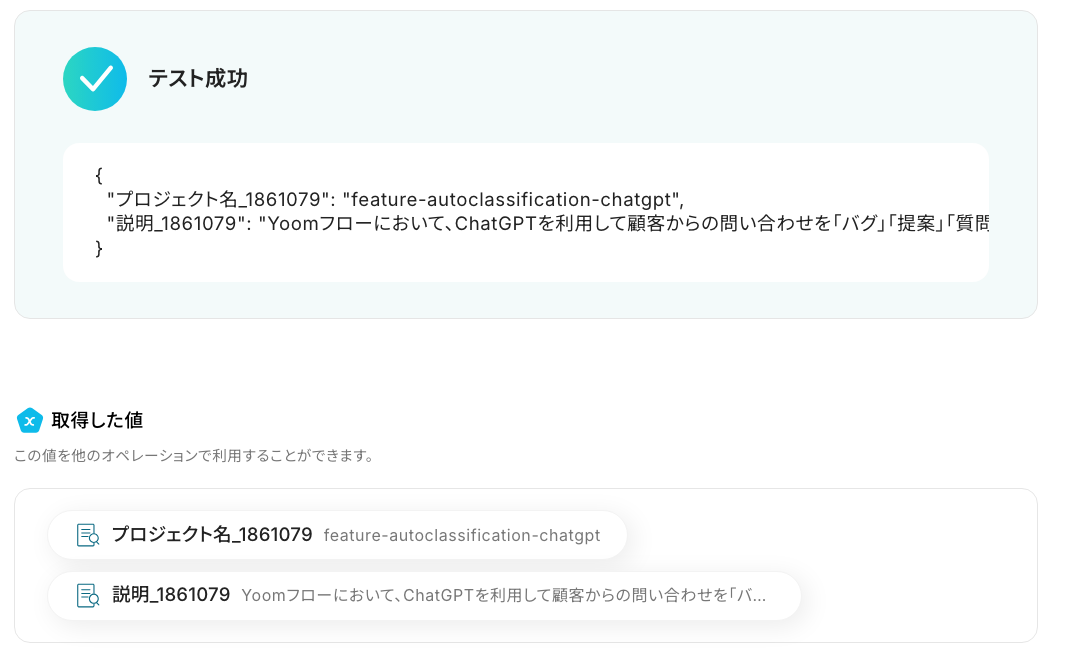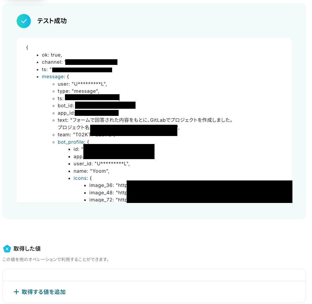 テストが成功すると、取得した値が表示されます。最後に「保存する」をクリックしてください。