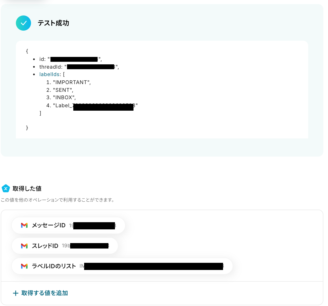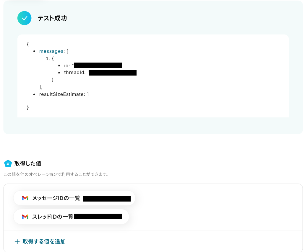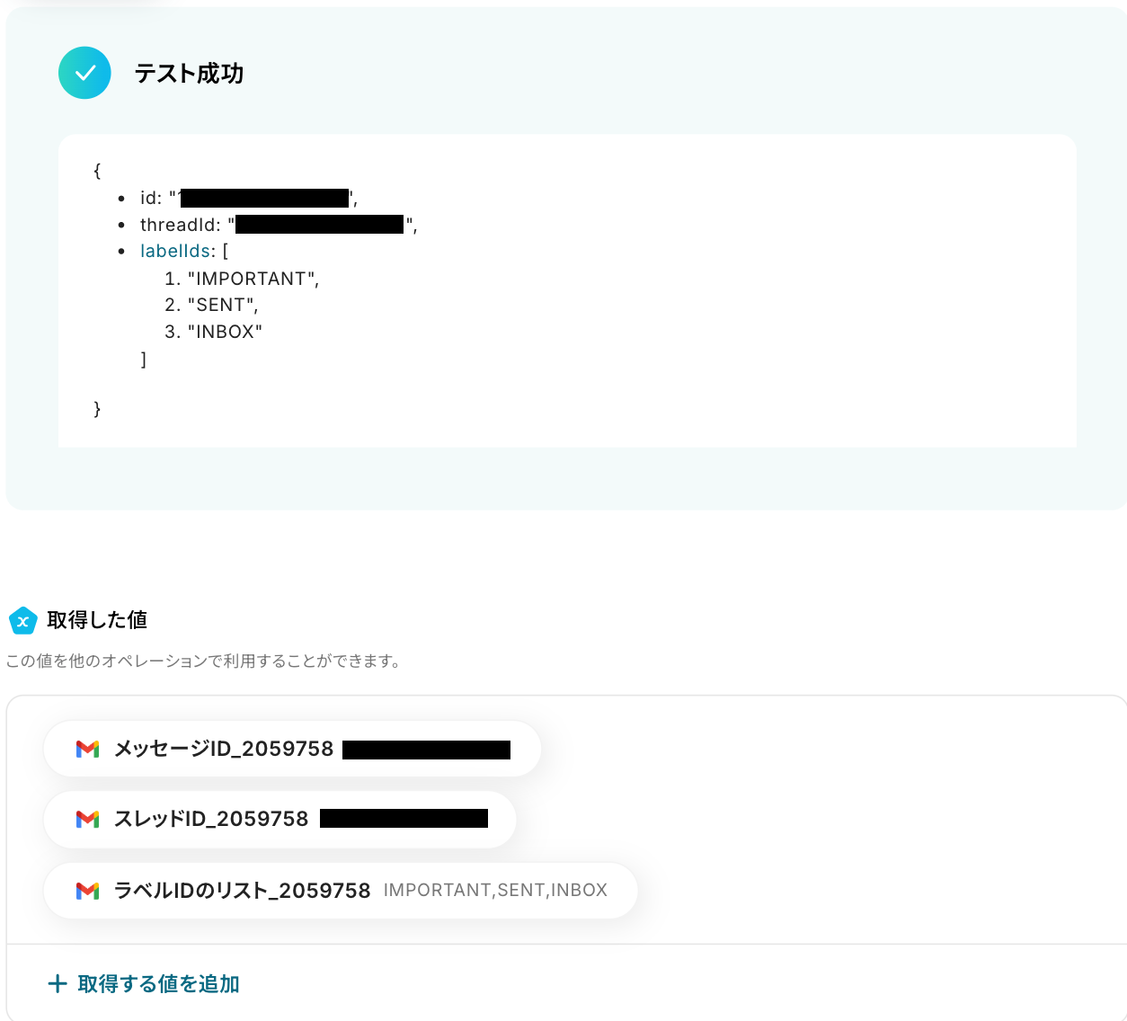 テストに成功すると取得した値として、メッセージIDとスレッドIDの一覧が表示されます。