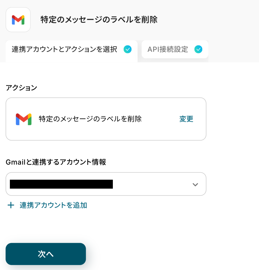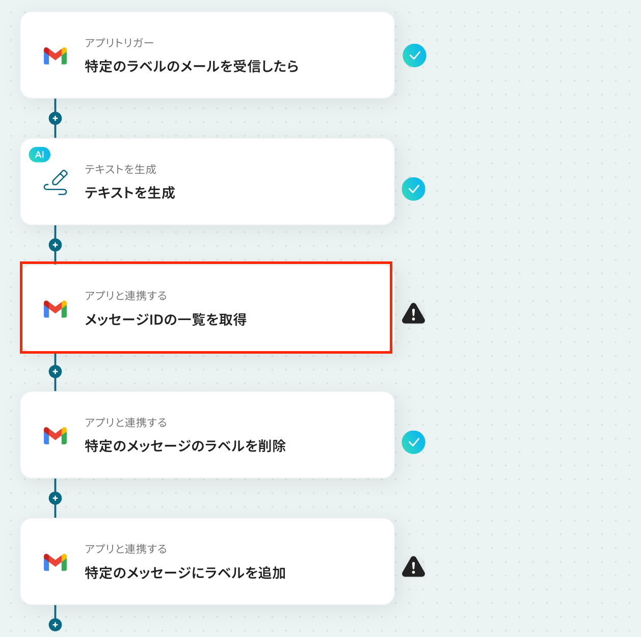 - 続いて、Gmailの「メッセージIDの一覧を取得」で対象のメールを特定し、「特定のメッセージのラベルを削除」で元のラベルを削除します。