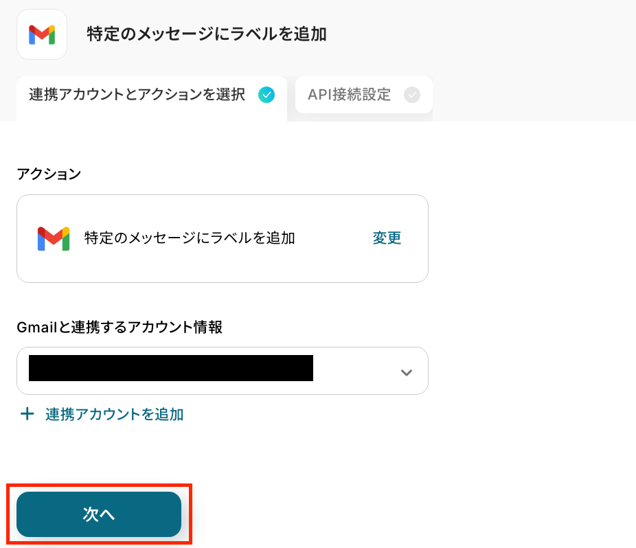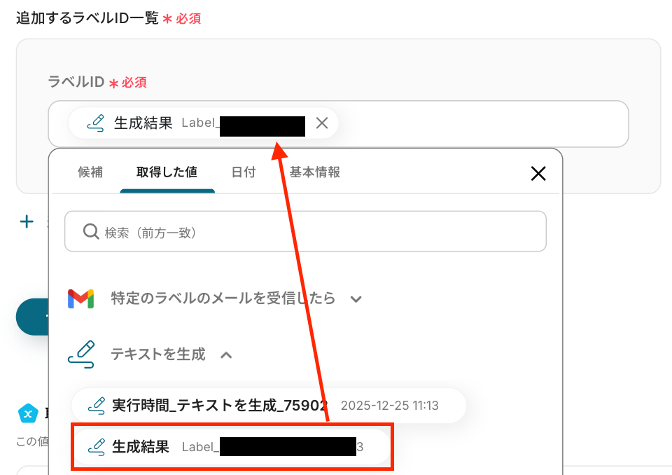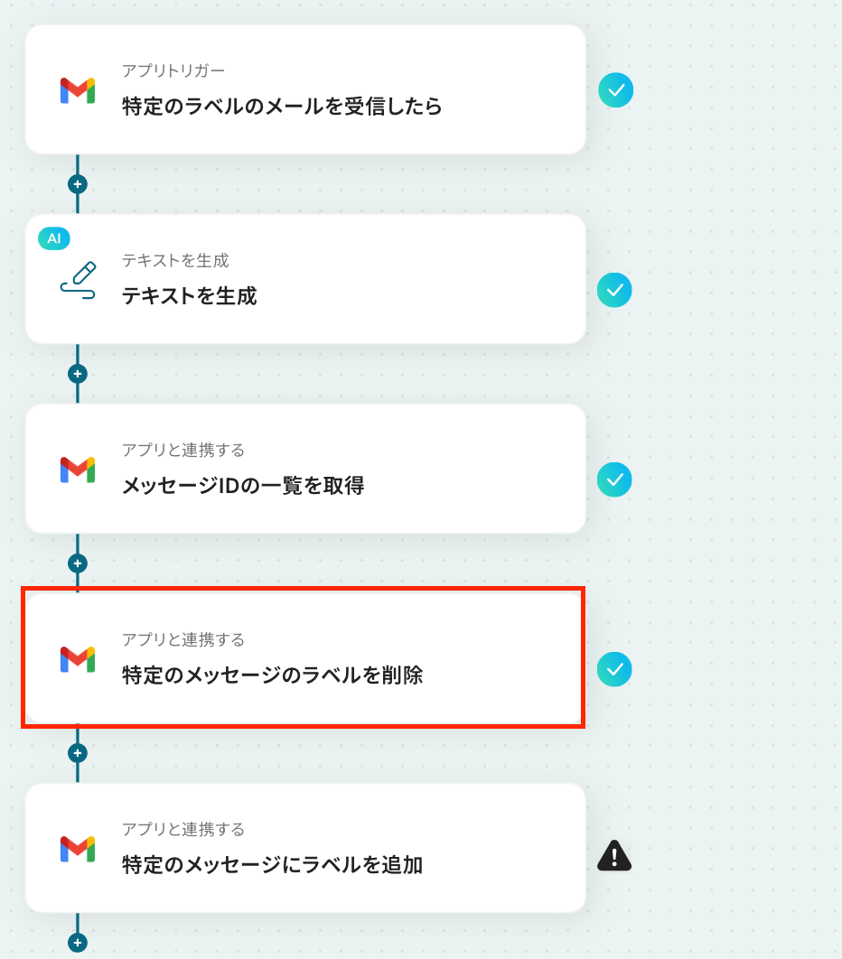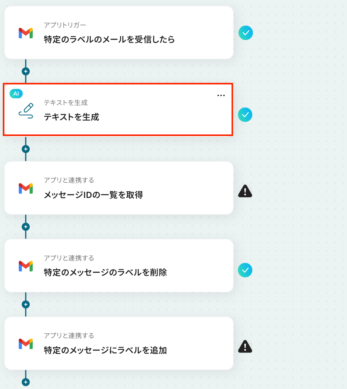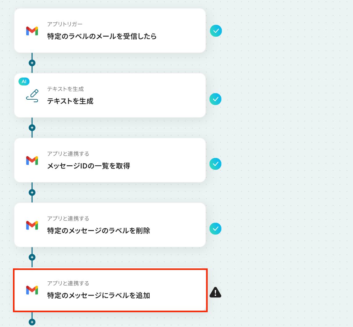 - 最後に、Gmailの「特定のメッセージにラベルを追加」アクションで、AIが生成した新しいラベルを付与します。
