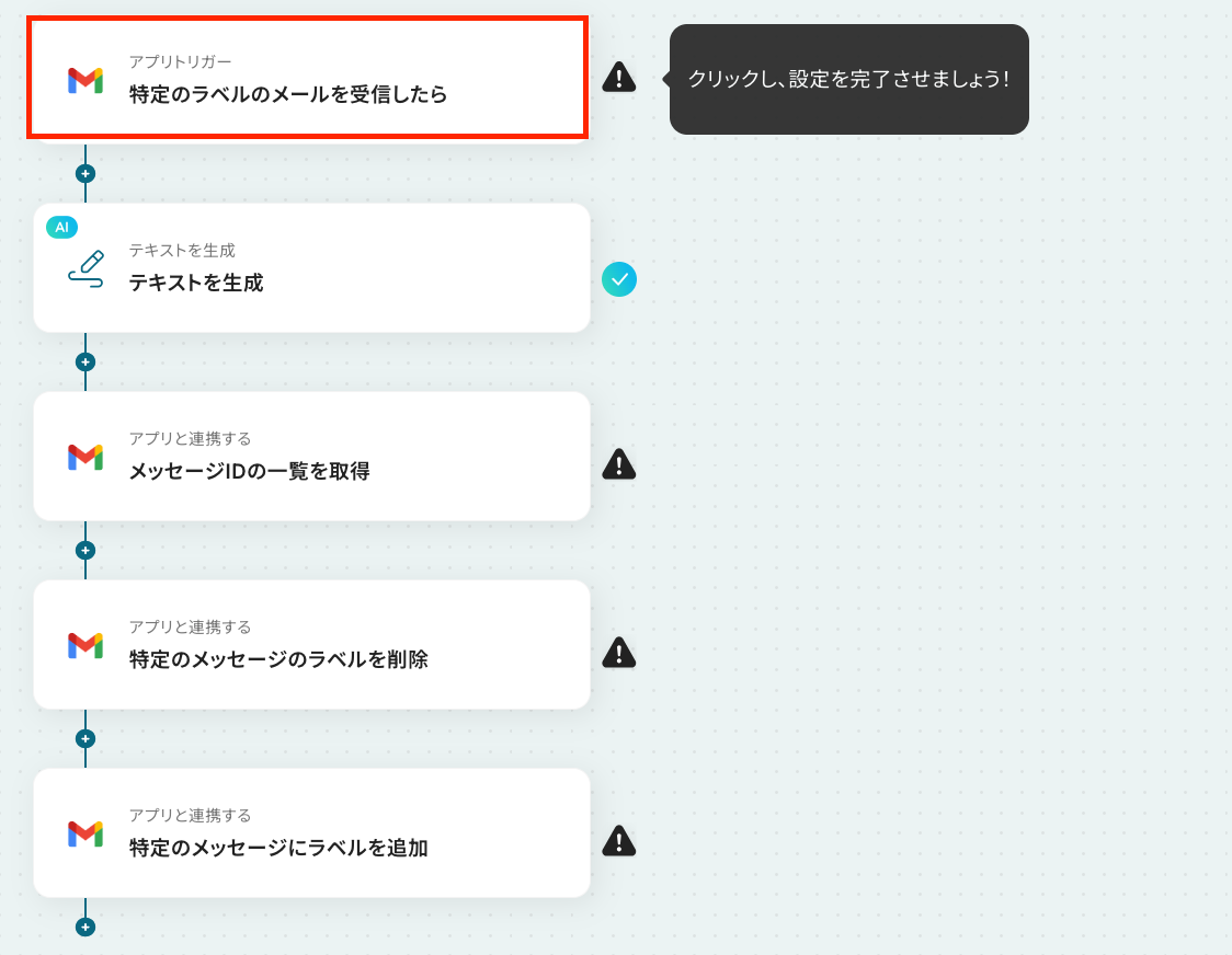 ここから「Gmailで特定ラベルのメールを受信したら、AIで適切なラベルに変更する」フローを設定していきます。