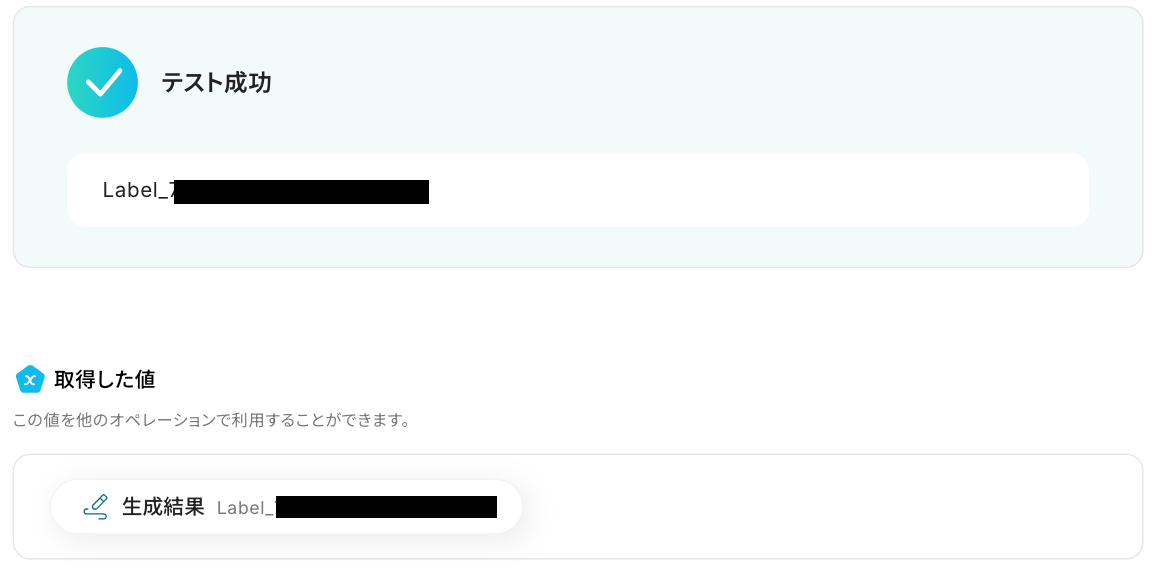 テストが成功すると、取得した値が表示されます。問題がなければ、「完了」をクリックしましょう!