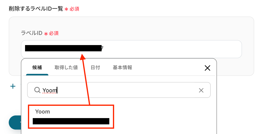 ※なお、上記で入力する「ラベルID」は、フローボット編集画面で「メッセージIDの一覧を取得」オペレーションをクリックし、「ラベル」の入力欄をクリックすると表示されます。