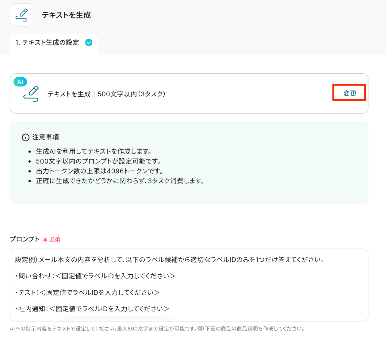 ここでは、AIでテキストを生成する際に使用するプロンプトを設定します。