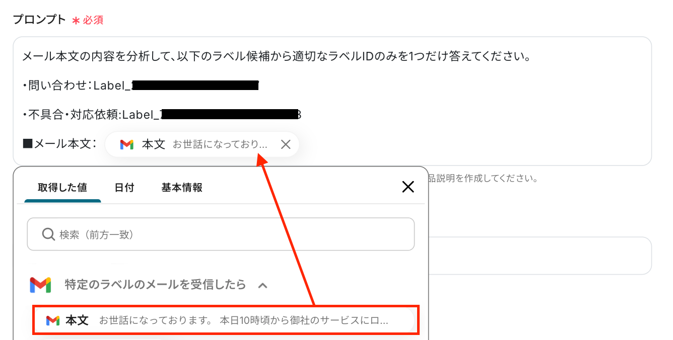 ここでは、生成AIを使用して、先ほど受信したメールに応じて適切なラベルを判定する設定を行います。
