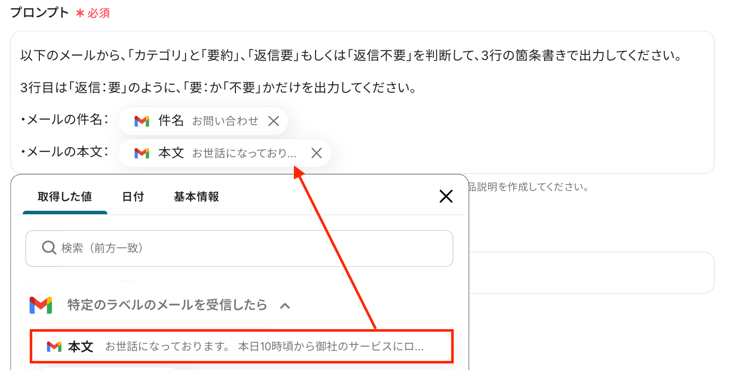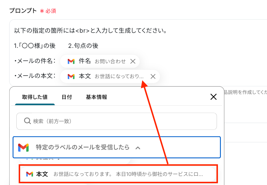 ここでは、AIでテキストを生成する際に使用するプロンプトを設定します。 今回はテンプレートを使用しているため既に設定されていますが、自由に設定することも可能です。 先ほど取得した値を組み合わせて設定してください。 取得した値は、入力欄をクリックすると表示されます!