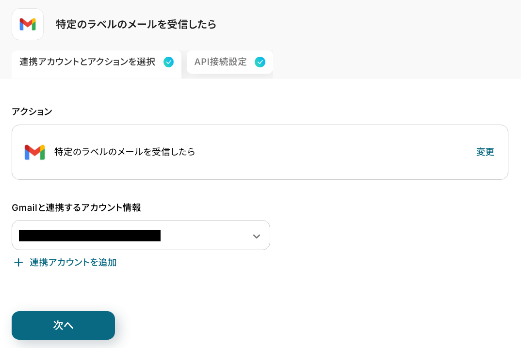 アクションはそのままで、連携するアカウント情報を確認します。 「次へ」をクリックして進みましょう!