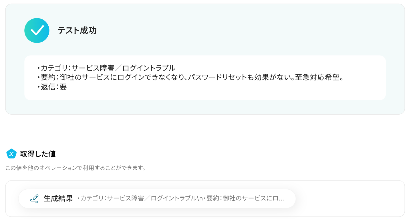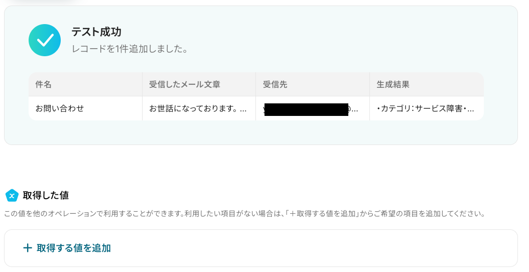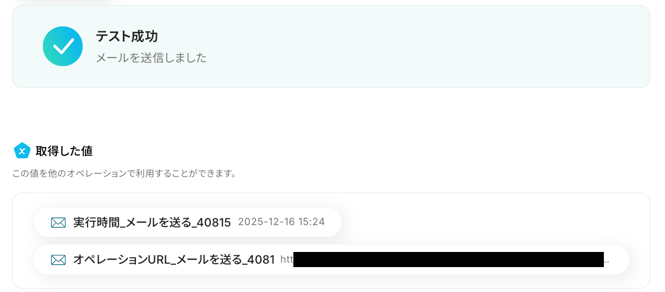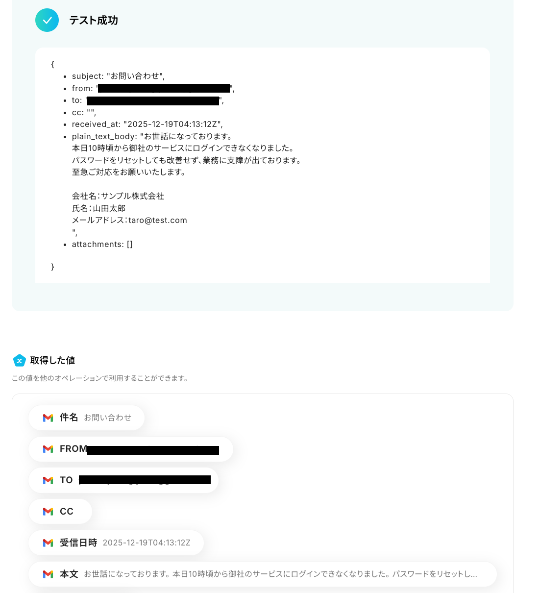 テストが成功すると、取得した値が表示されます。 先ほどテスト送信したメール内容が反映されていれば、OKです!※ 取得した値 とは? トリガーやオペレーション設定時に、「テスト」を実行して取得した値のことを指します。 後続のオペレーション設定時の値として利用でき、フローボットを起動する度に変動した値となります。