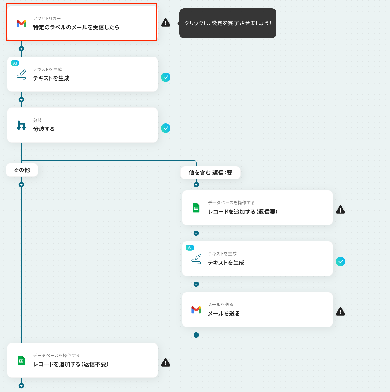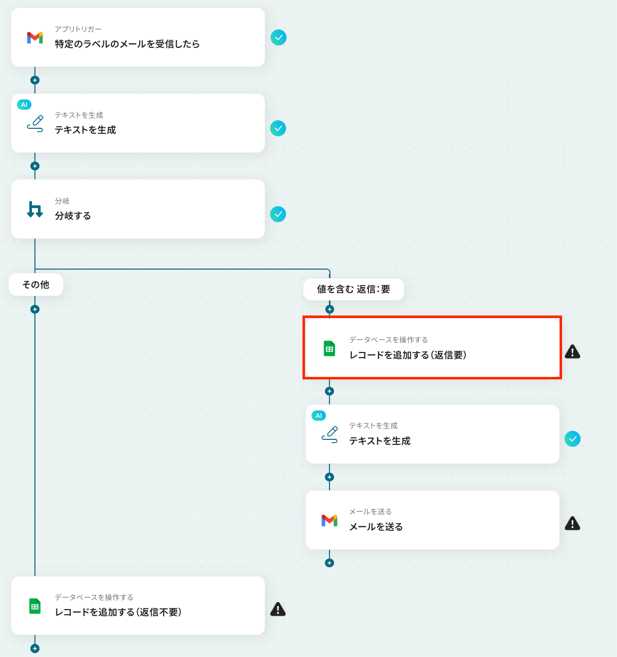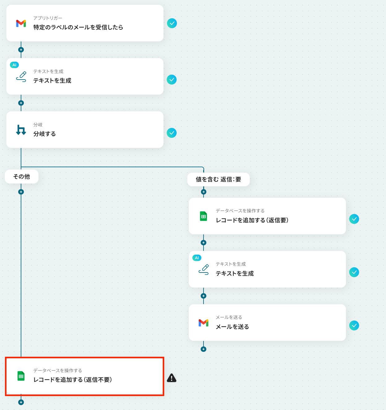 ステップ9:Google スプレッドシートにレコードを追加する設定 ここでは、返信が不要だった場合に、メールの返信などは行わずGoogle スプレッドシートに受信メールの文章などを追加する設定を行います。 それでは、以下の赤枠をクリックしましょう!