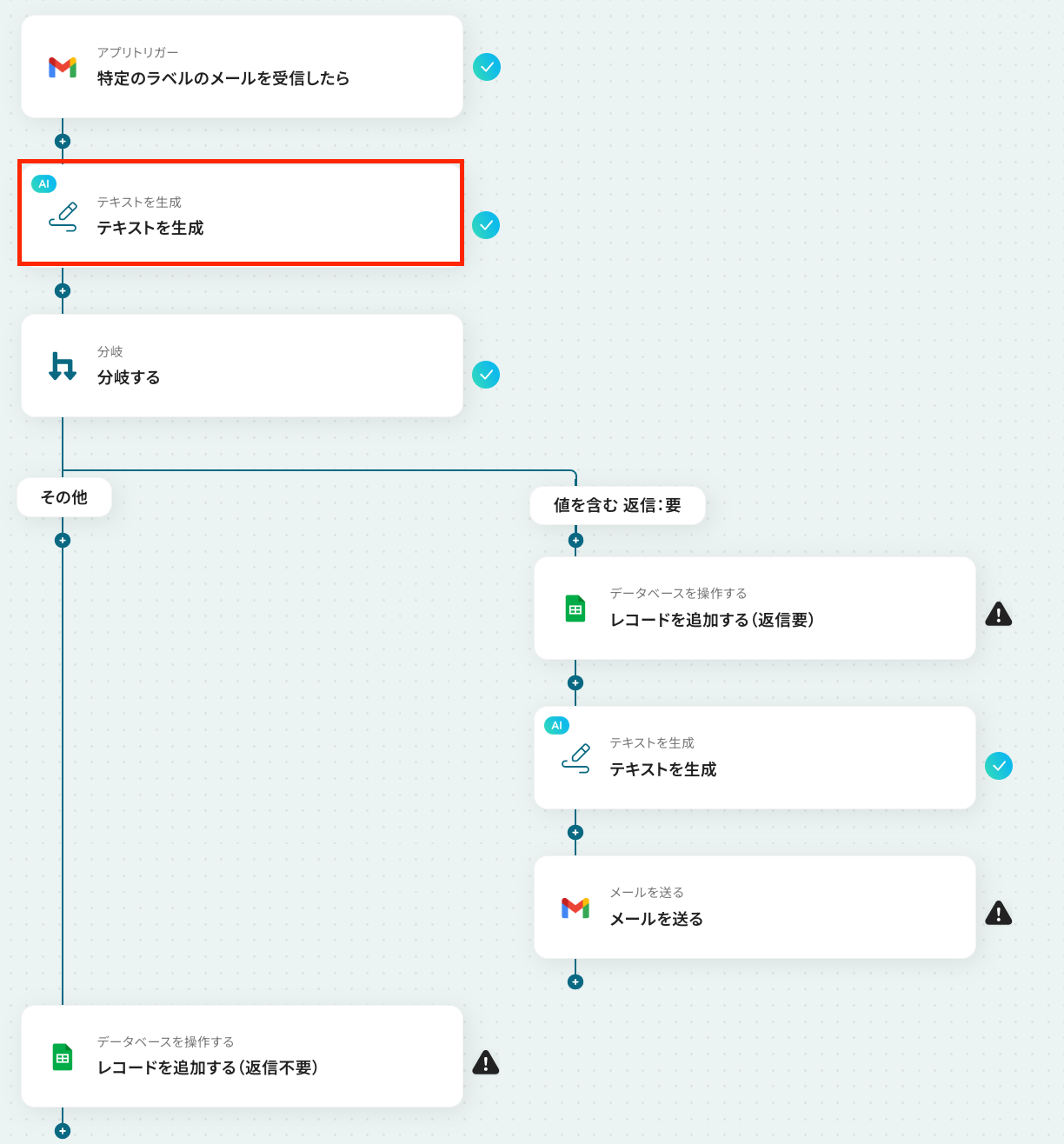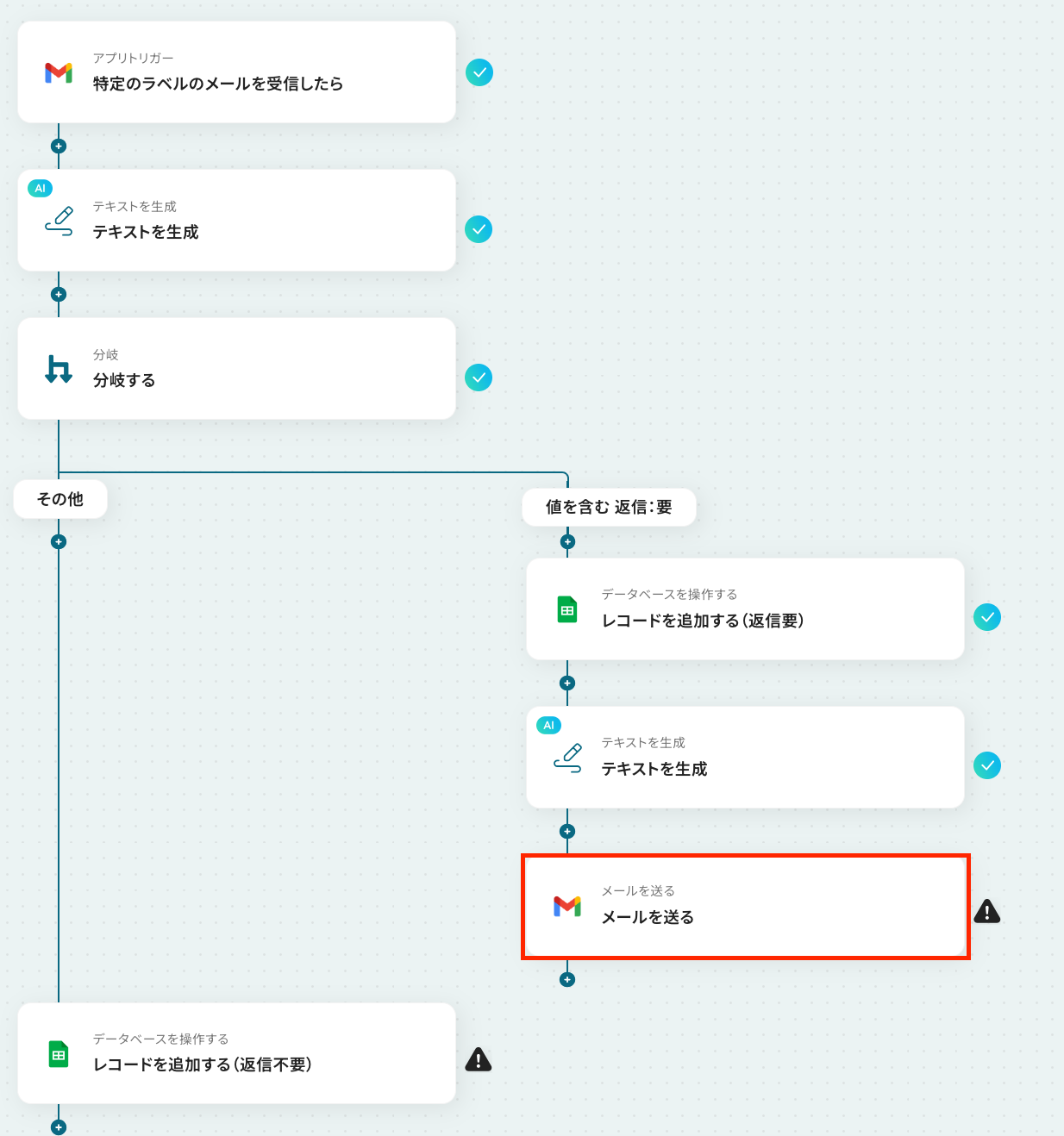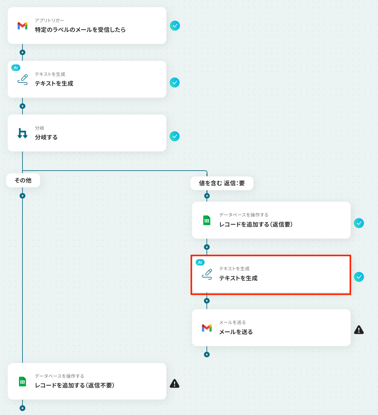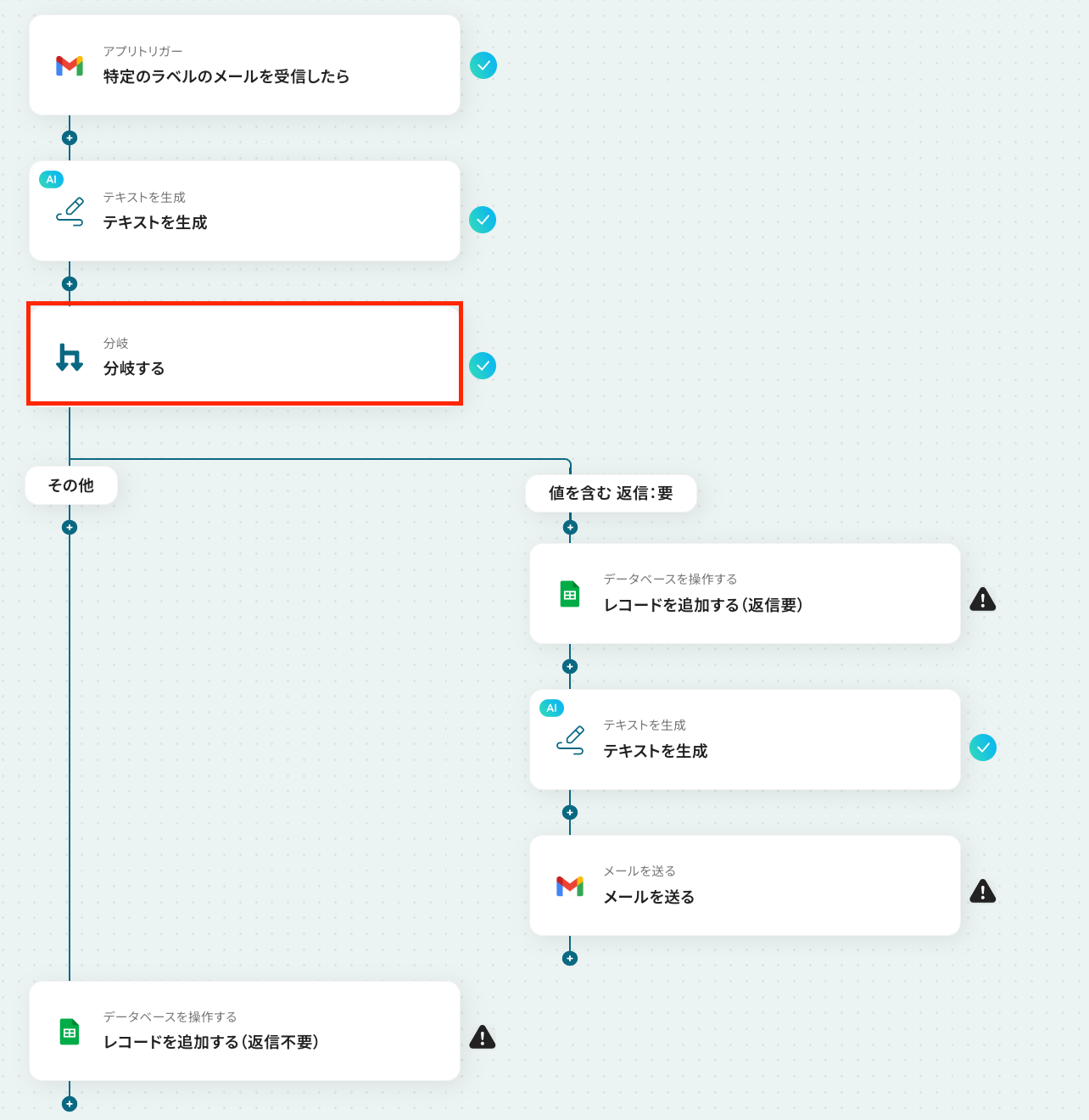 ステップ9:Google スプレッドシートにレコードを追加する設定 ここでは、返信が不要だった場合に、メールの返信などは行わずGoogle スプレッドシートに受信メールの文章などを追加する設定を行います。 それでは、以下の赤枠をクリックしましょう!