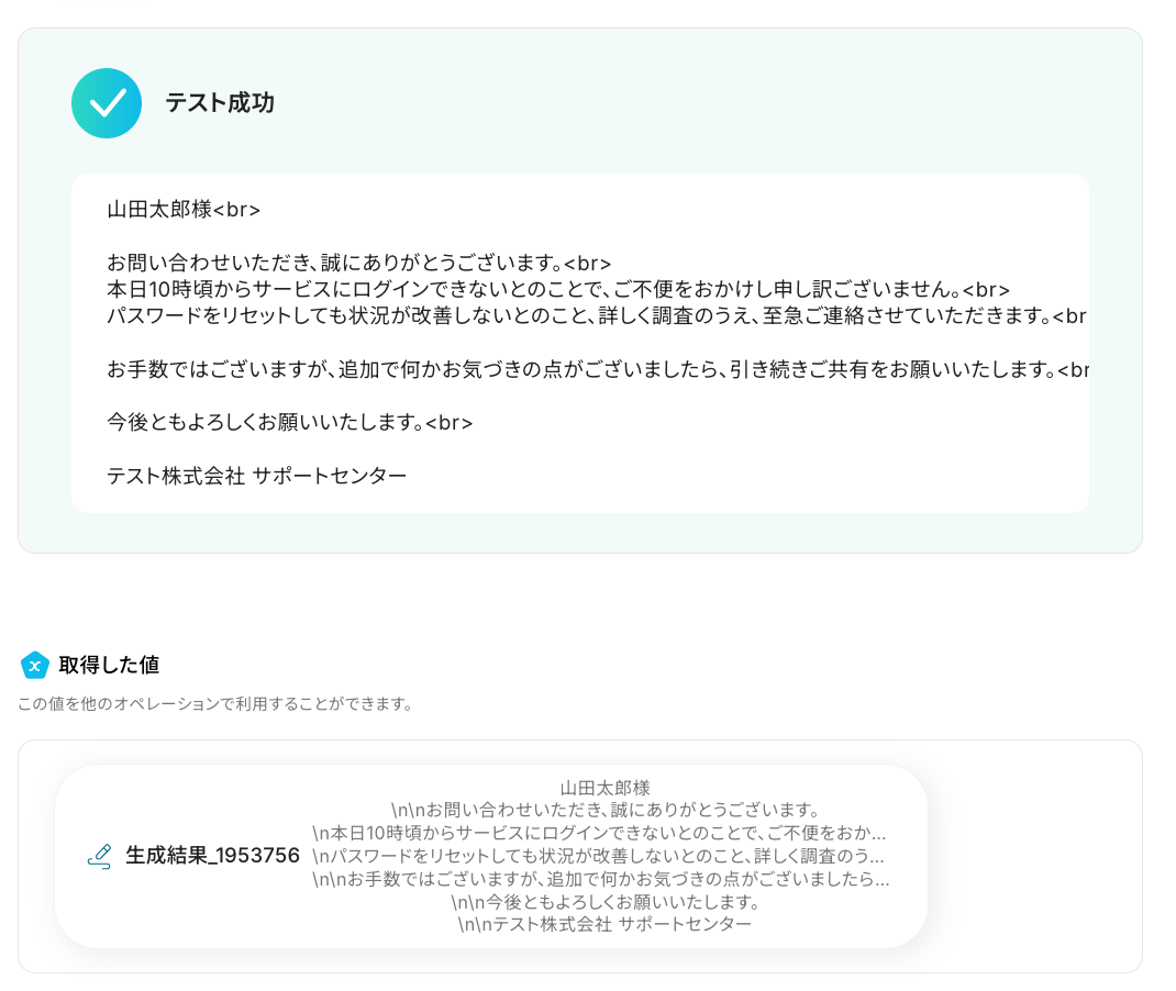 設定ができたら、「テスト」をクリックします。 テストが成功すると、取得した値として返信文章が表示されます。
