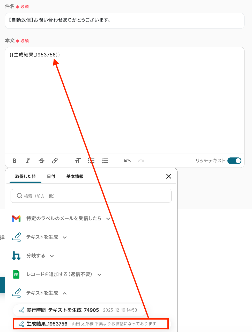 本文 :任意の文章を設定 ※任意で作成した文章と先ほどのテキスト生成設定で取得した値を引用します。 自由に設定してください。