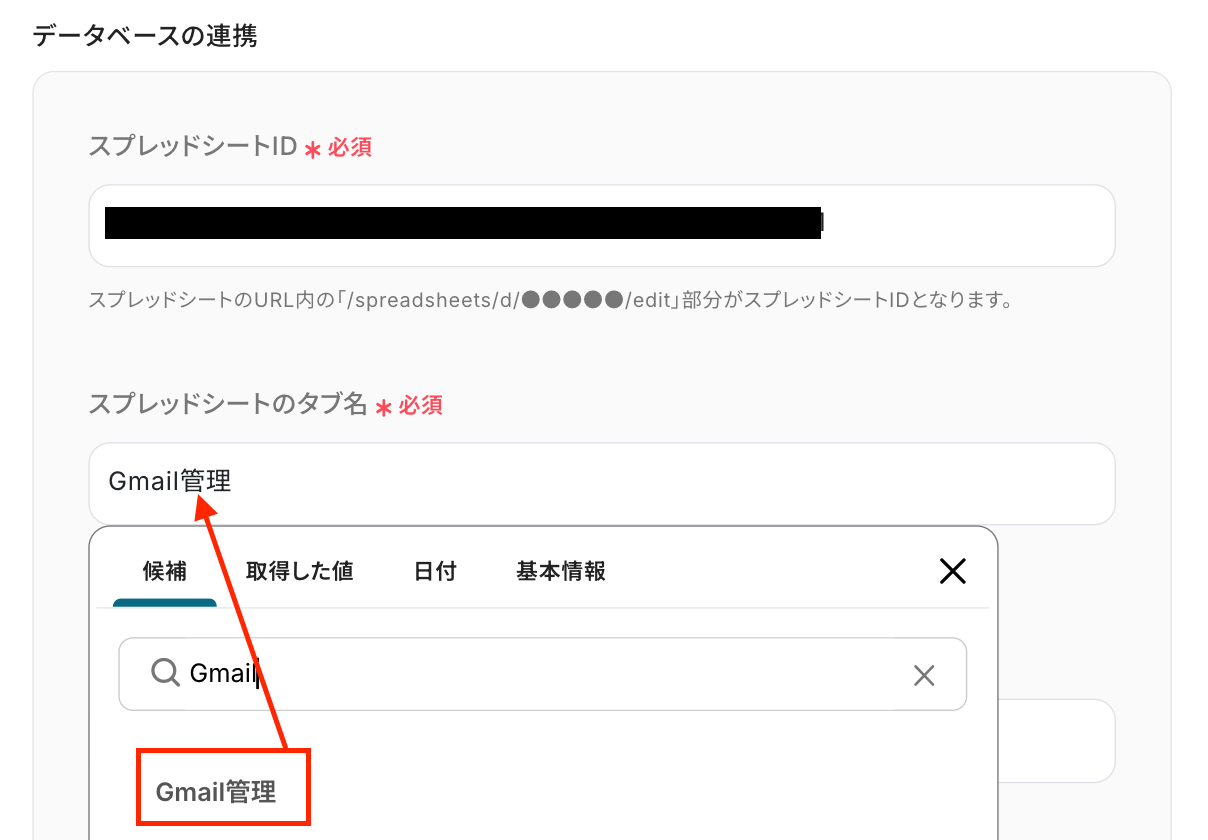 「スプレッドシートのタブ名」 :入力欄をクリックし、候補から選択してください。